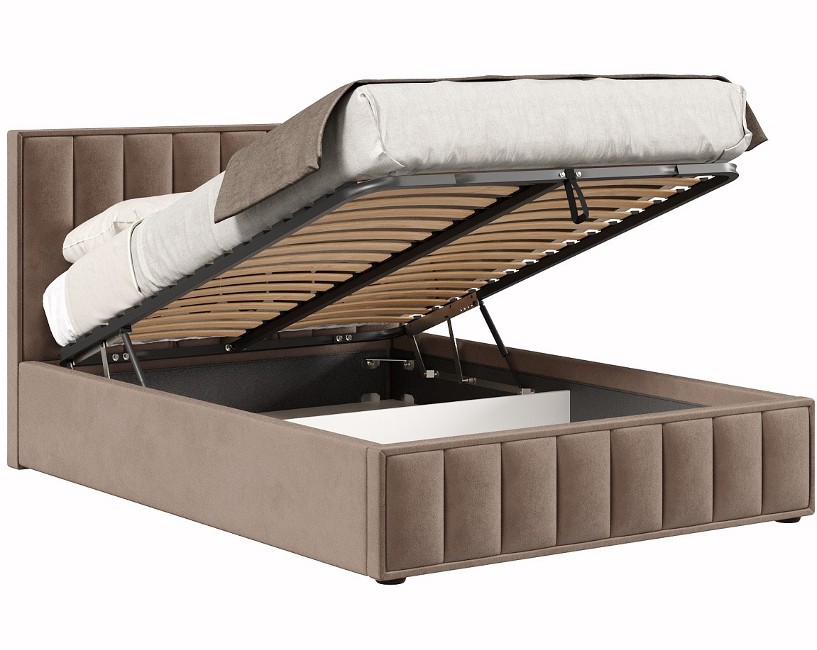 В дизайне кровати с подъёмным механизмом Анкона гармонично сочетаются элегантность, индивидуальность и практичность. Мягкая обивка создаёт атмосферу уюта. Отличительной чертой этой модели является повторяющийся узор, который присутствует на изголовье и изножье. Вертикальные строчки подчёркивают симметричность и чёткость линий кровати.