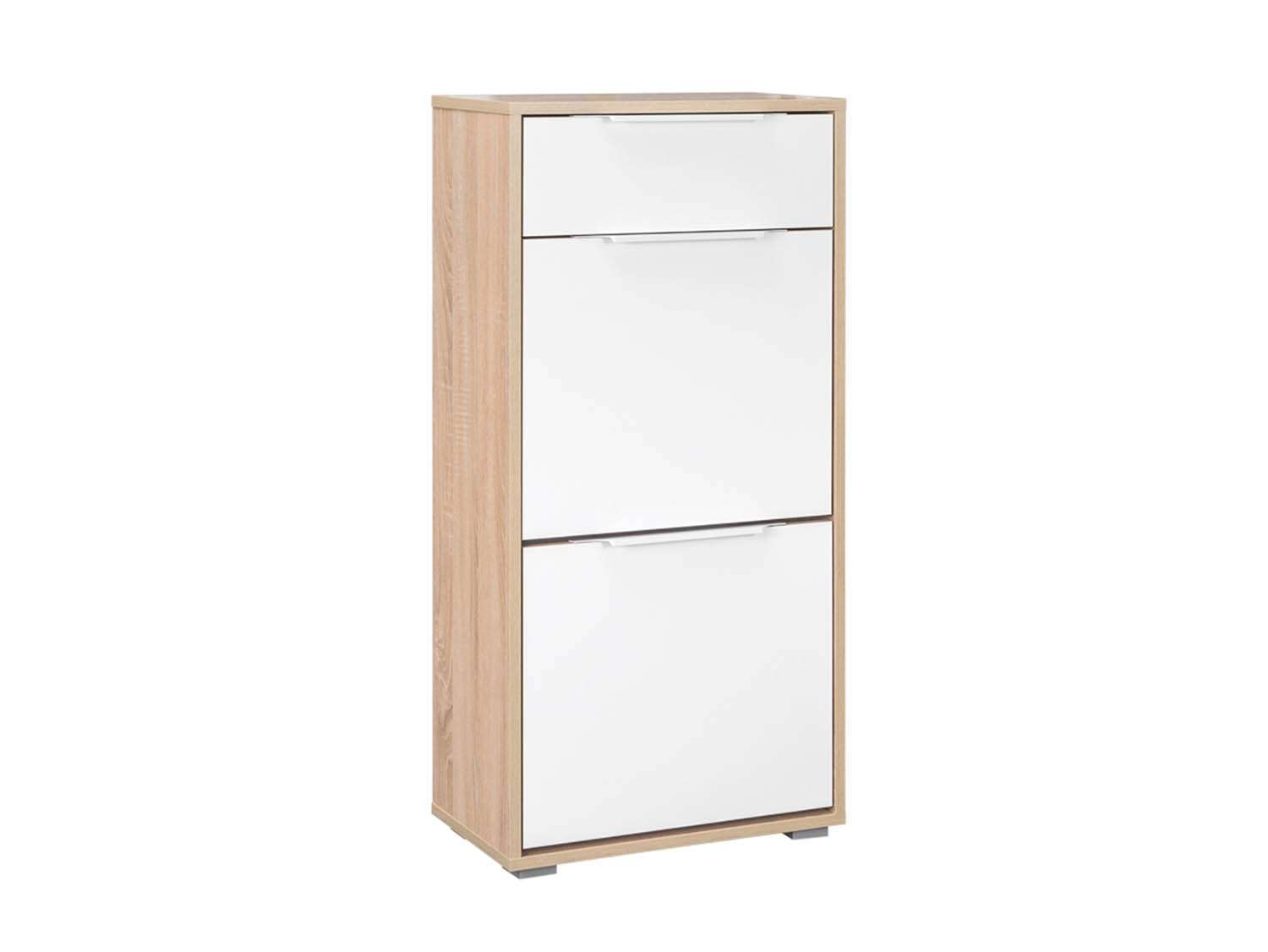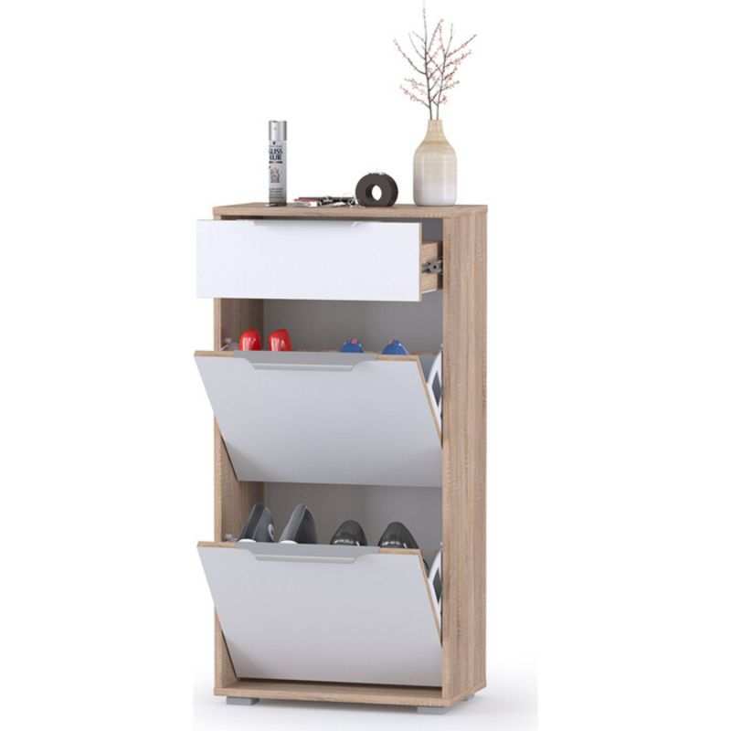 Конструкция с выдвижным ящиком вверху и 2я откидными секциями для обуви внизу.