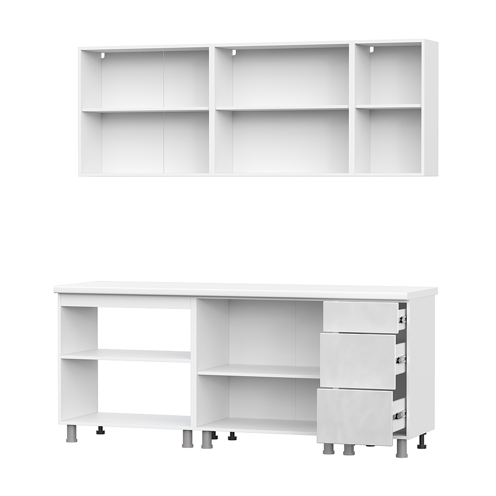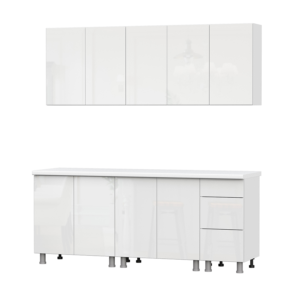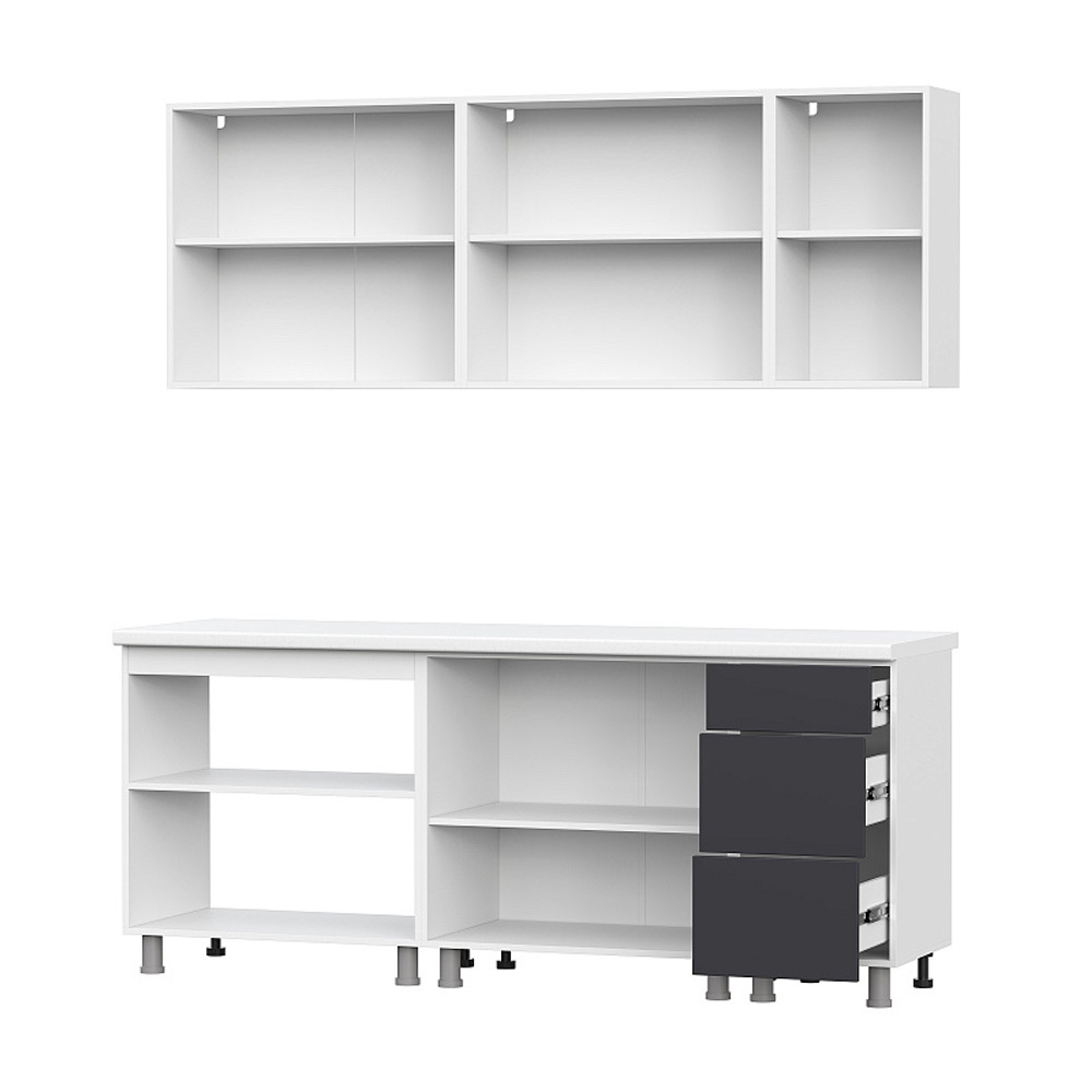 Готовая кухня Модерн - компактное и функциональное решение для вашего дома. Все фасады универсальные. Кухня комплектуется опорами, регулируемыми по высоте. Кухонный гарнитур «Модерн New» не комплектуется ручками, но имеет разметку под ручки с межцентровым расстоянием 128 мм. Ручки, толкатели PUSH LATCH, столешница, стеновая панель, а также дополнительное оборудование (мойка, смеситель, бытовая техника) приобретаются отдельно. Данная кухня доступна также в качестве модульной системы, что позволяет создать любую конфигурацию под размеры вашего помещения. Особенности: — Материал корпуса: ЛДСП — Материал фасада: МДФ — Направляющие ящиков: Шариковые — Максимальная нагрузка на ящик: 5 кг — Максимальная нагрузка на полку: 10 кг — Столешница комплектацией не предусмотрена