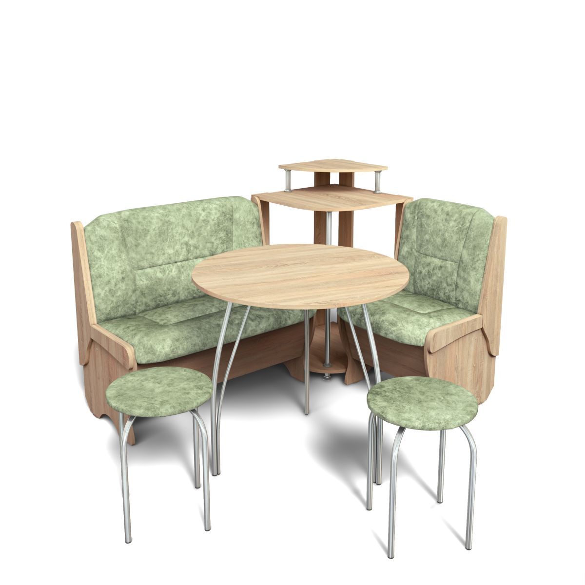 Набор включает уголок с мягкими сиденьями и спинками, стол и два табурета.