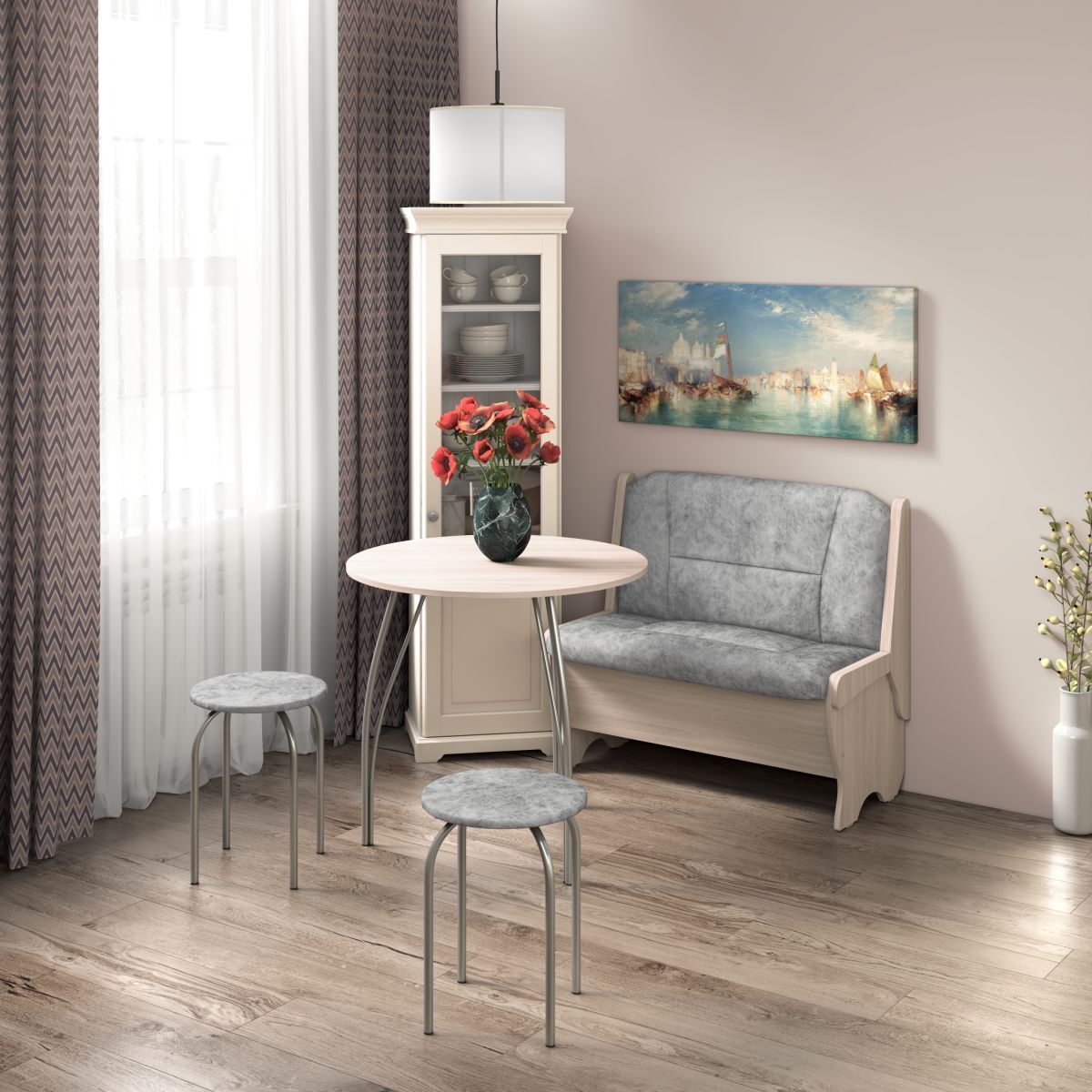 Набор включает комфортный диванчик с мягкими сиденьем и спинкой, круглый стол и 2-е табуретки с мягкими сиденьями.