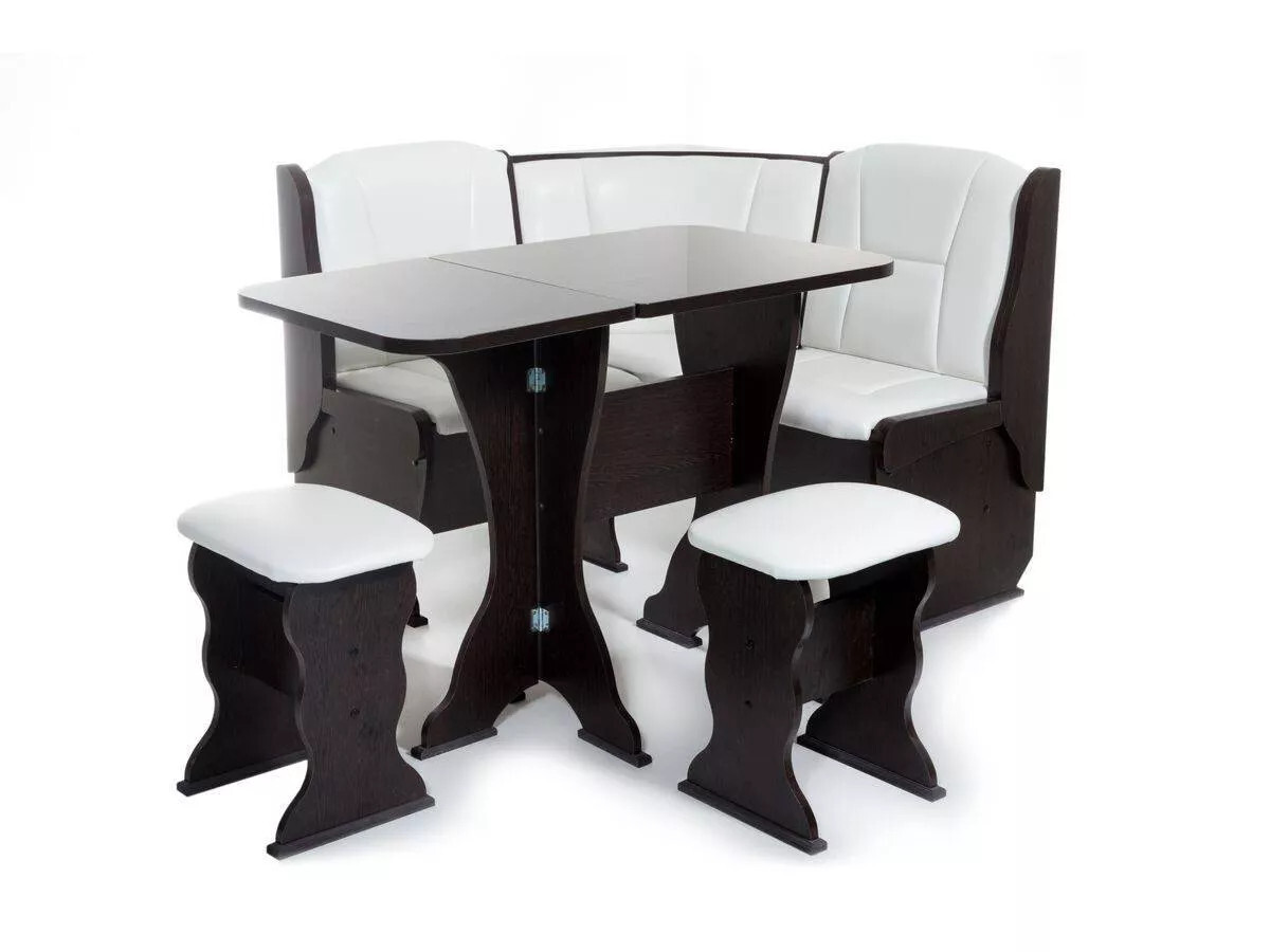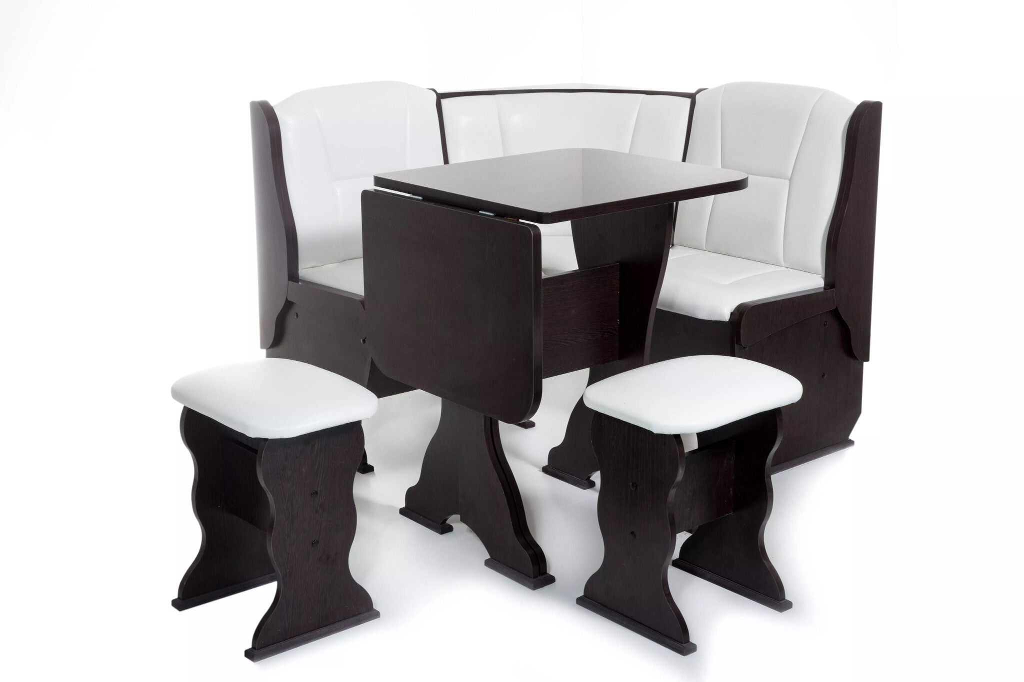 В комплект набора входят скамья большая, скамья маленькая, угловой элемент, стол трансформер и два табурета. Скамьи и угловой сегмент имеют мягкие спинки и сиденья, которые обтягиваются качественной экокожей. Варианты цветового решения экокожи позволят подобрать набор, подходящий под Ваш интерьер. Также в скамьях имеются ящики для хранения мелких предметов.