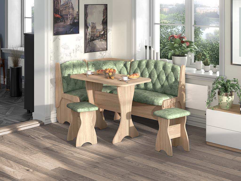 В состав набора входят: угловой диван, обеденный стол и 2 табурета.