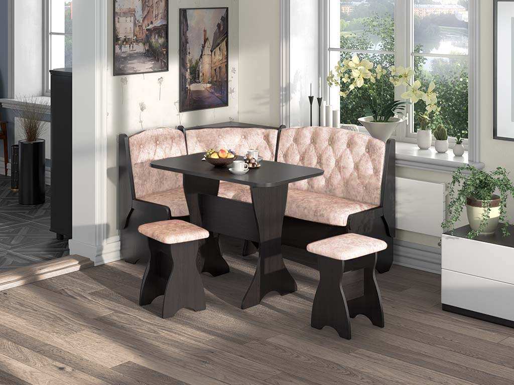 В состав набора входят: угловой диван, обеденный стол и 2 табурета.