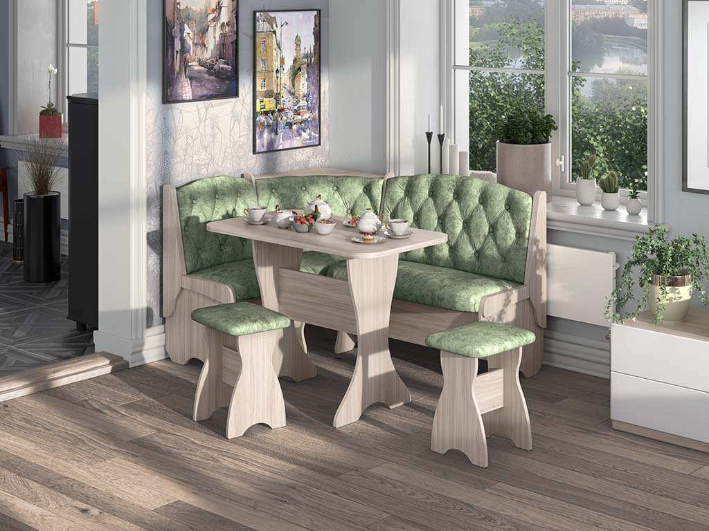 В состав набора входят: угловой диван, обеденный стол и 2 табурета.