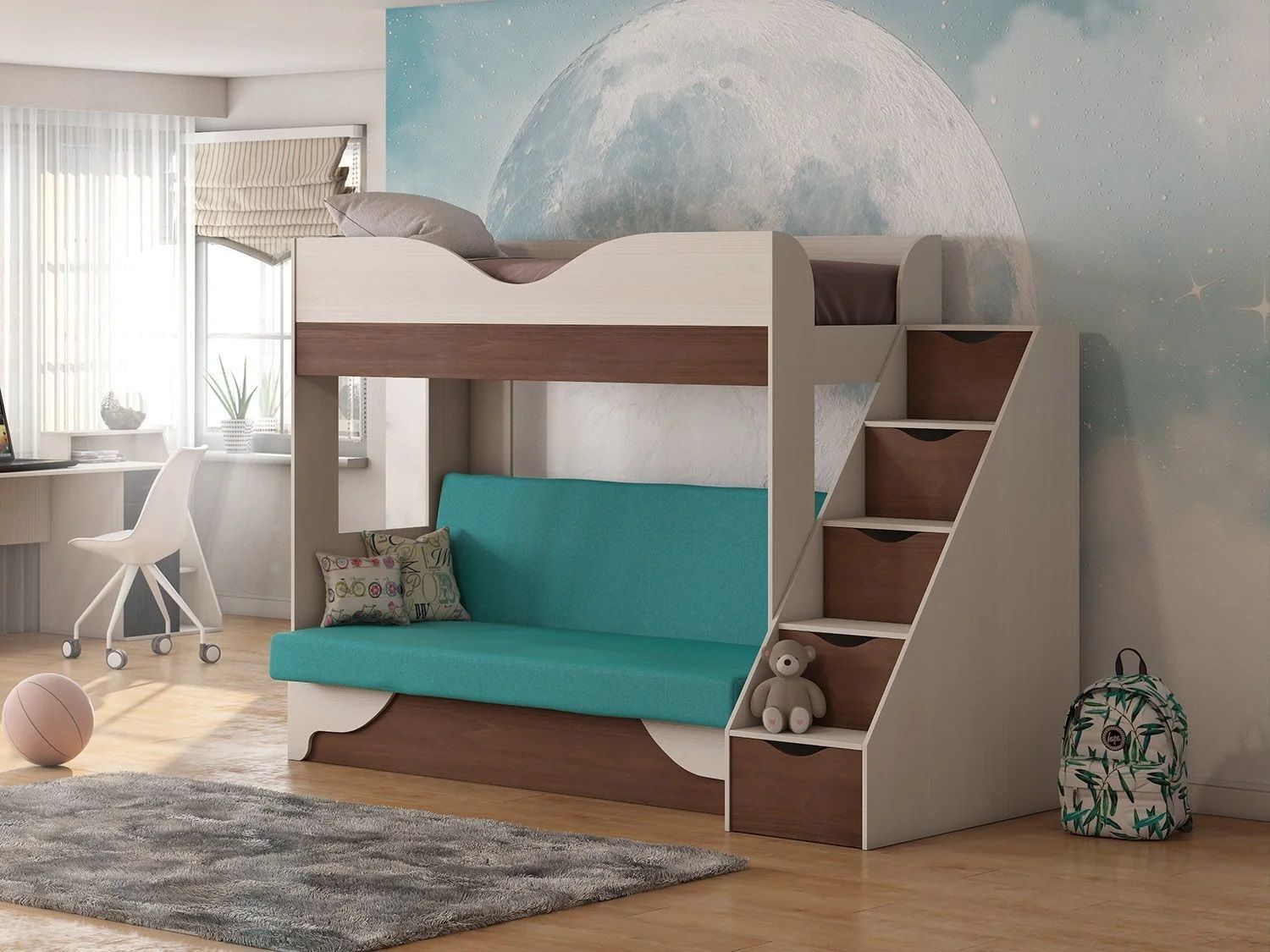 Латте 77-01 кровать-диван Бодега Светлый / Орех Донской / Велюр Морская волна - готовое решение для двух спальных мест в детской комнате.