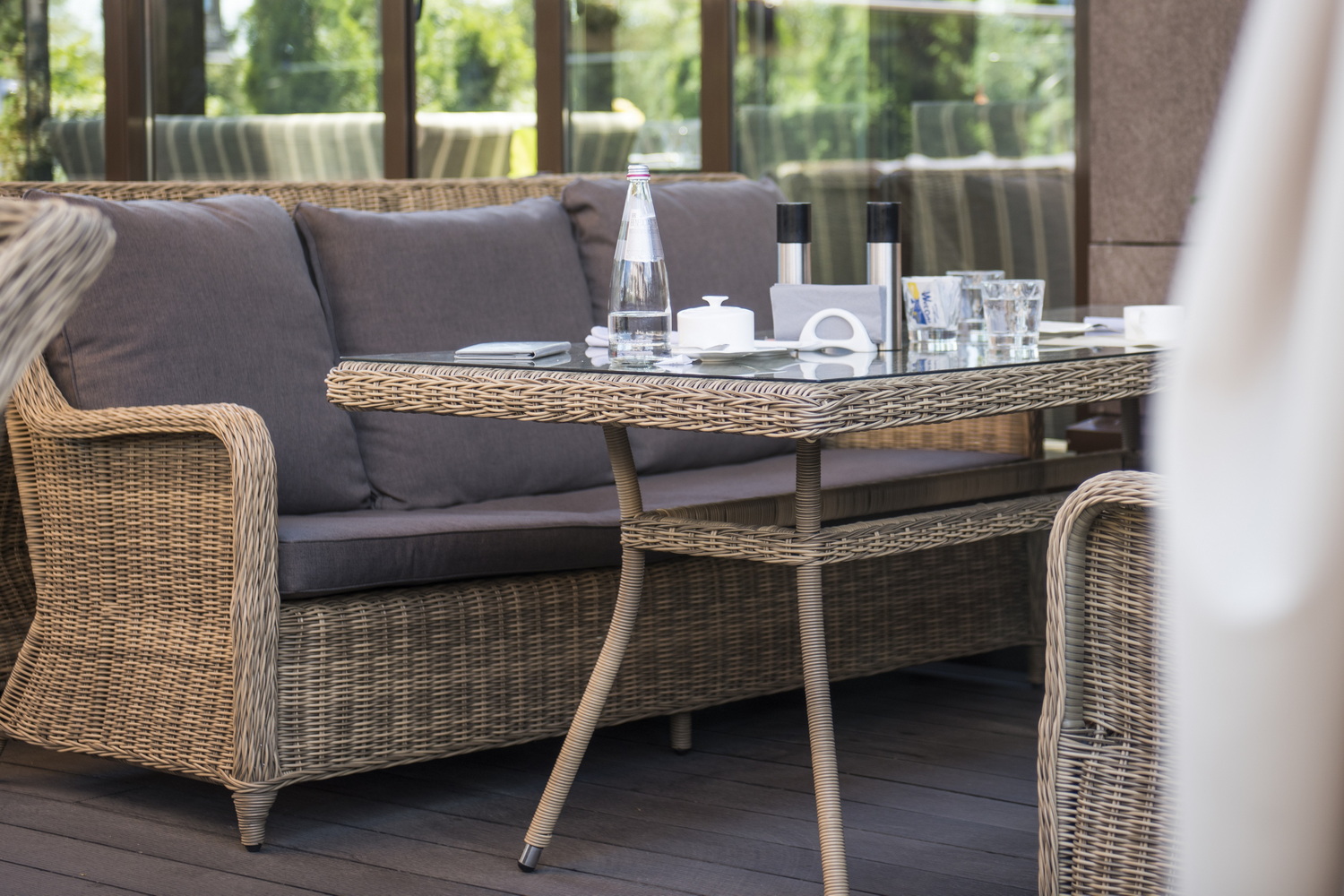 Материал устойчив к перепадам погоды, прямым солнечным лучам, атмосферным осадкам, легко моется. Столешница изготовлена из прочного стекла, толщиной 5 мм.
