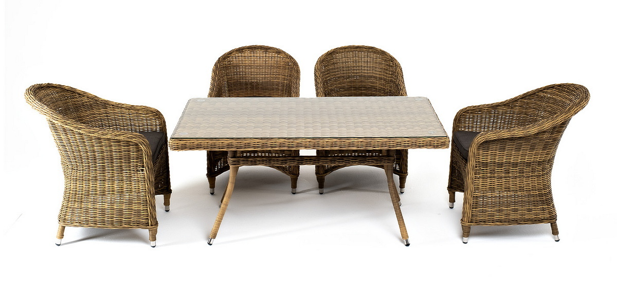 "Латте" плетеный стол из искусственного ротанга 140х80см, цвет соломенный 1шт. 1 400Х800Х750, "Равенна" плетеное кресло из искусственного ротанга, цвет соломенный с серо-коричневой подушкой 4шт. 570Х680Х810,