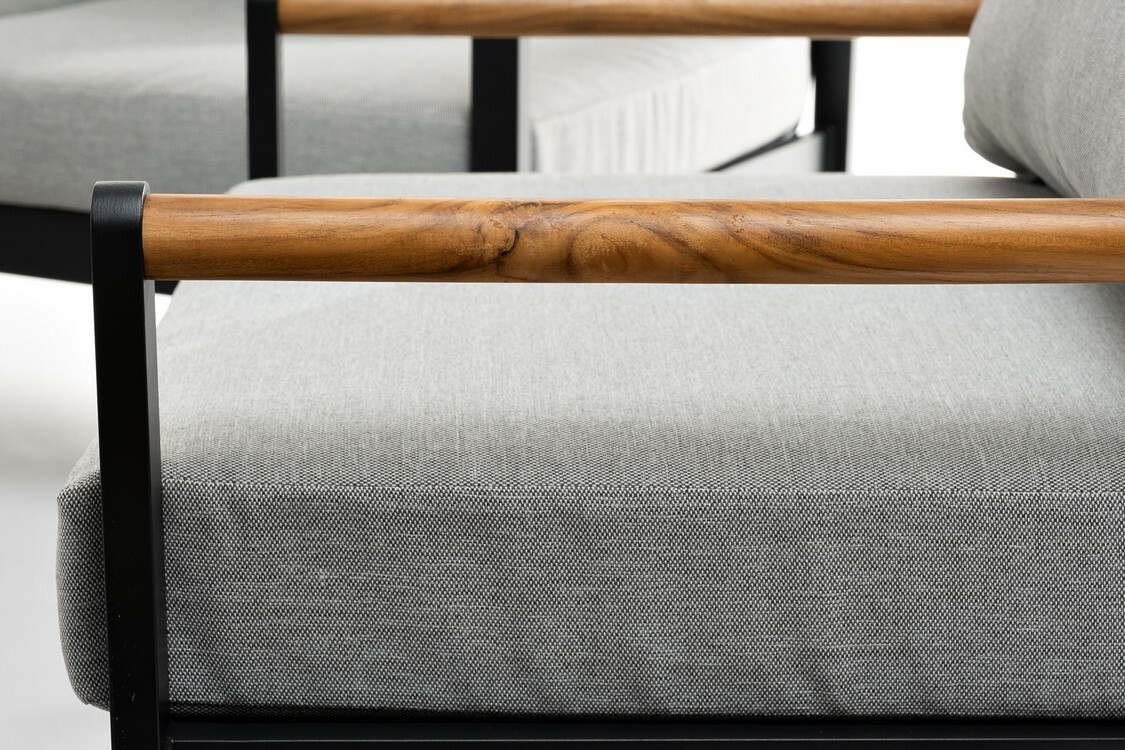 Дополняют конструкцию элементы из массива тика. Мягкие элементы мебели выполнены из водоотталкивающей ткани Olefin.