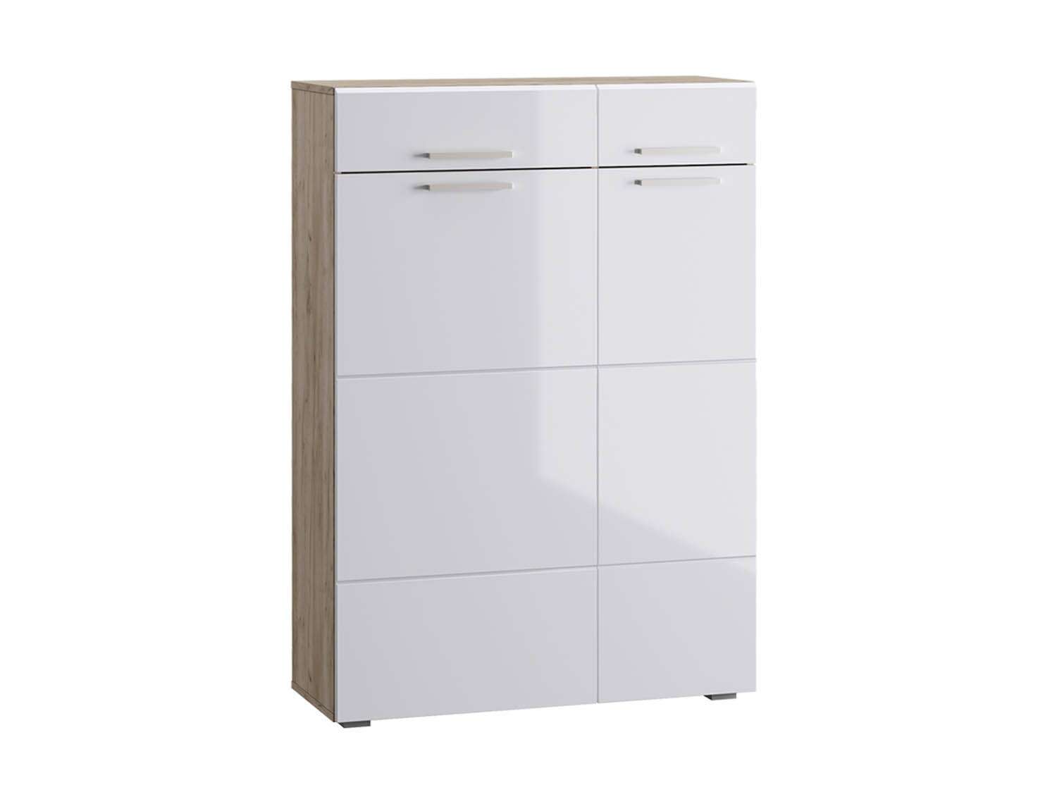Конструкция с 2я выдвижными ящиками вверху и двумя секциями с дверками для обуви внизу.