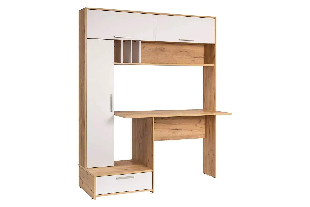 Рабочий стол отлично подойдет для комнаты школьника или организации домашнего офиса. Современный дизайн конструкции прекрасно впишется в интерьер любой комнаты. На широкой столешнице можно свободно разместить ноутбук, настольную лампу и письменные принадлежности. Богатая система хранения позволит содержать рабочее место в чистоте и порядке. Конструкция состоит из закрытого вертикального блока с тремя полками, выдвижного ящика и двух объемных ниш с откидными дверцами. Дополнительно в систему включена большая открытая полка с отсеками для документов.