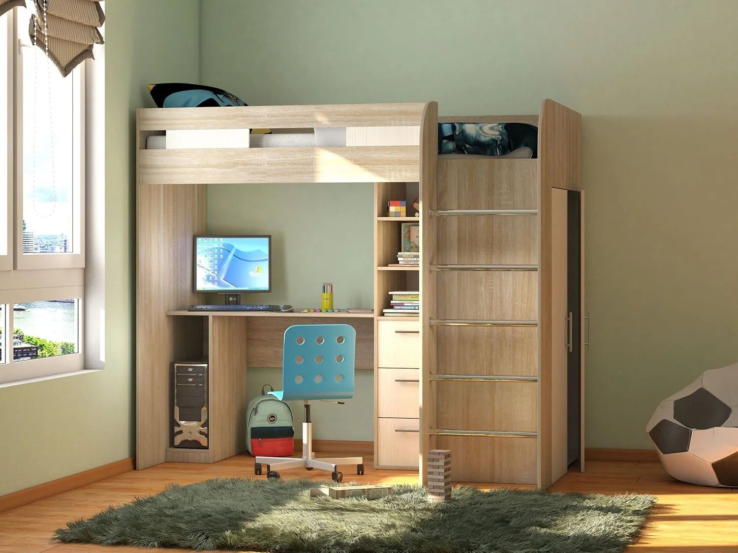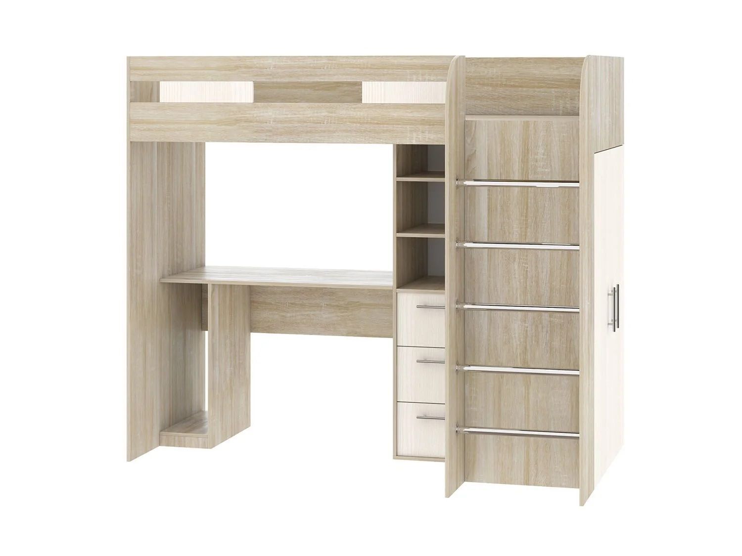 Лео кровать-чердак Дуб Сонома / Белый снег - универсальный предмет интерьера для двух спальных мест в детской комнате.