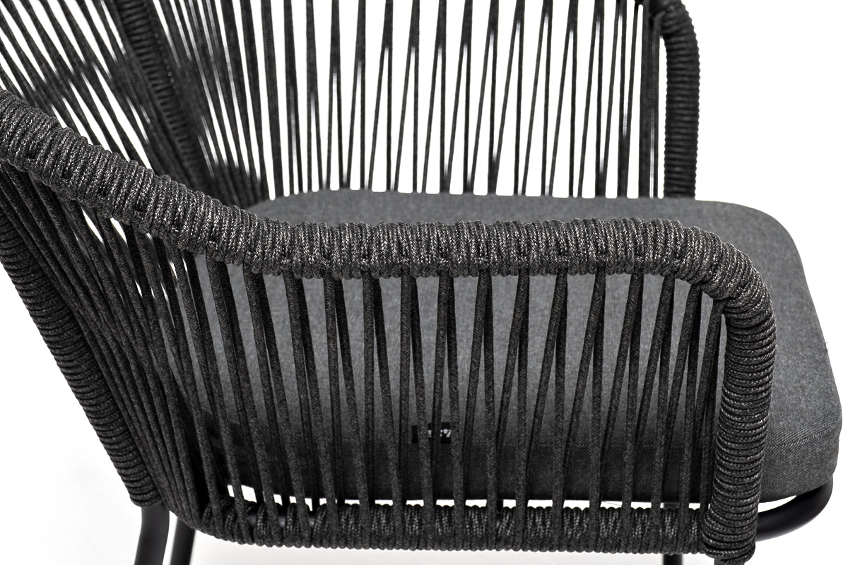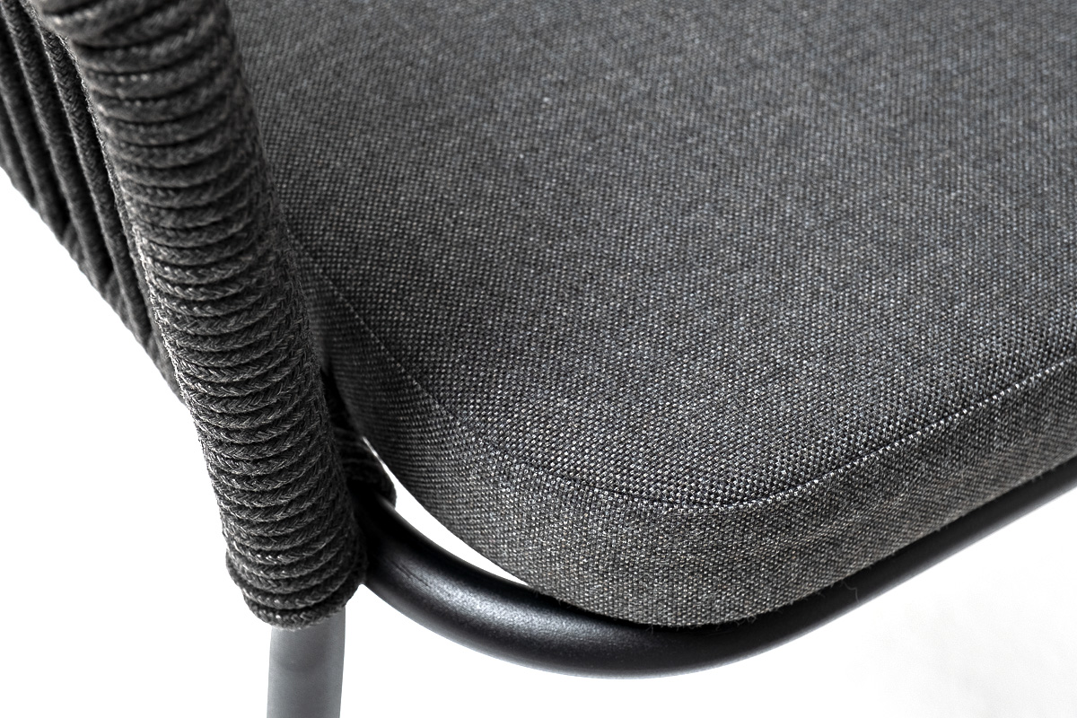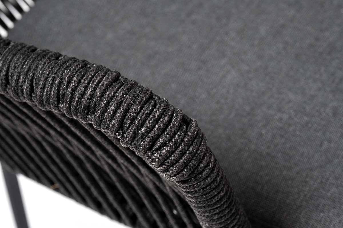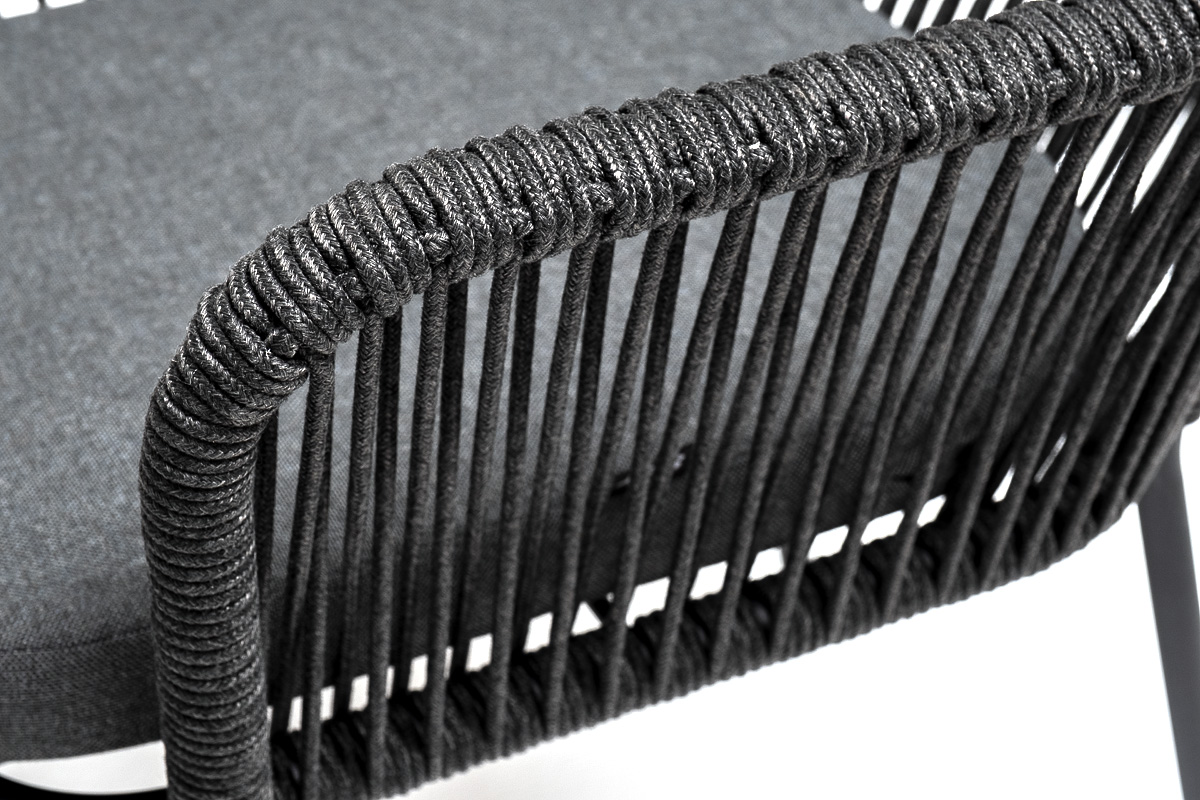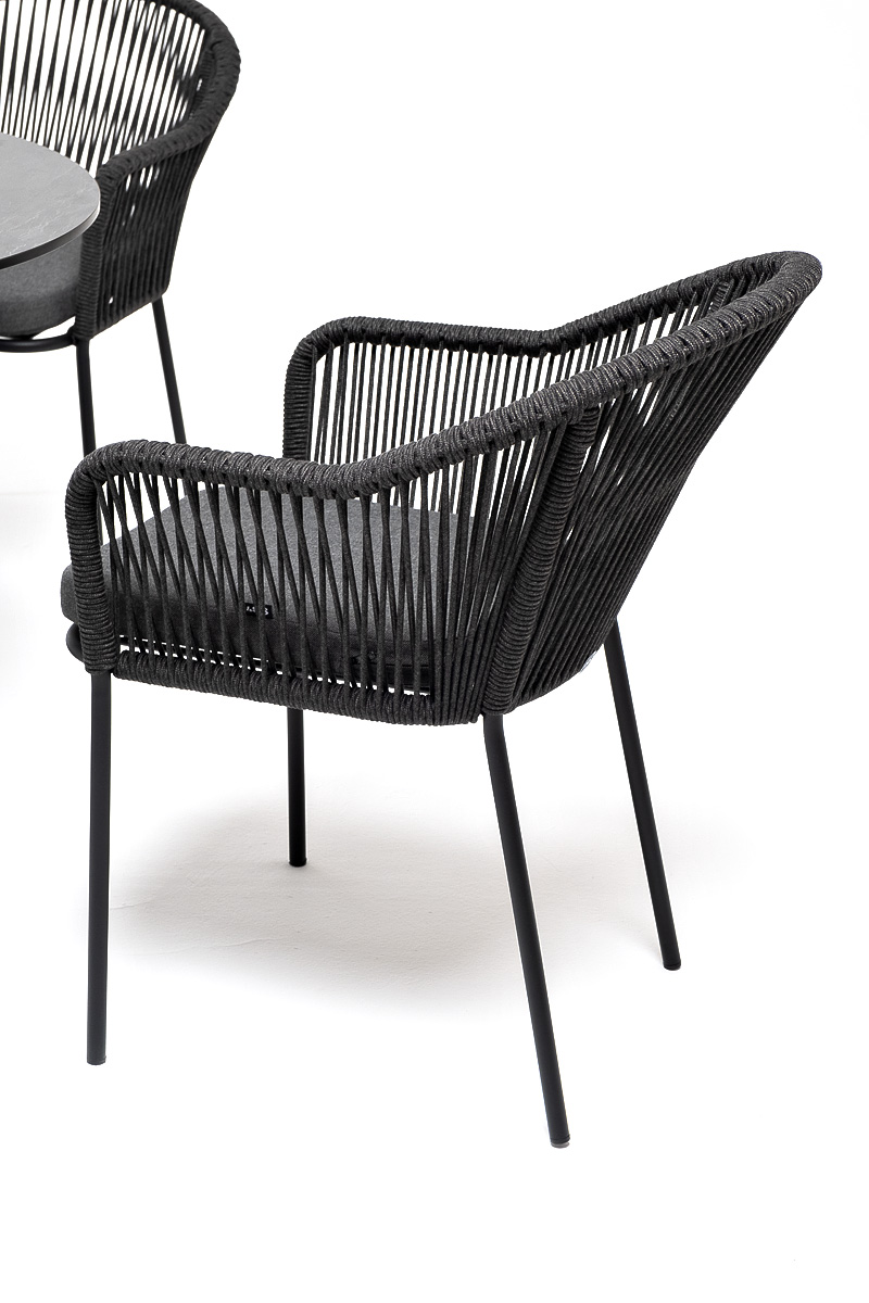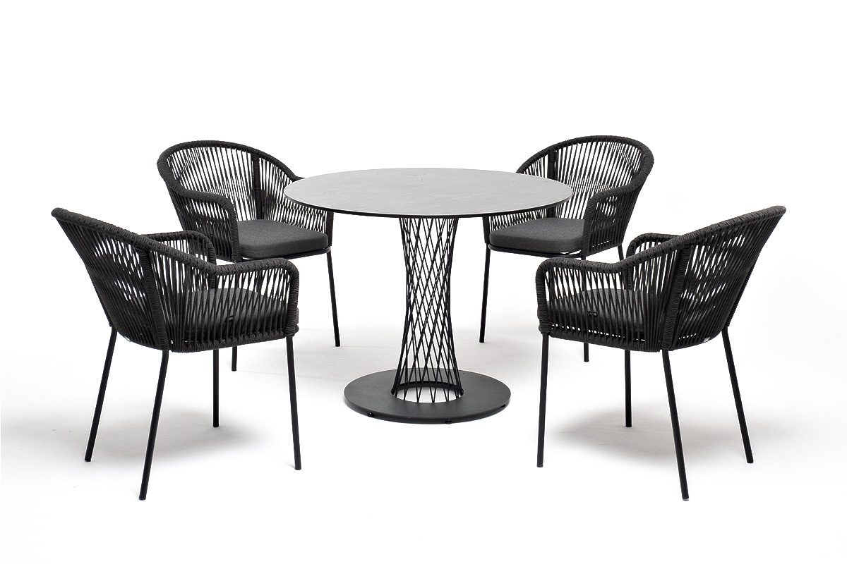 Каркас стульев выполнен из с "Лион" стул плетеный из роупа, каркас из стали темно-серый (RAL7024) муар, роуп темно-серый круглый, ткань темно-серая 027 4шт. 570Х620Х820, "Диего" обеденный стол из HPL круглый Ø90см, цвет "серый гранит" 1шт. 900Х900Х750,