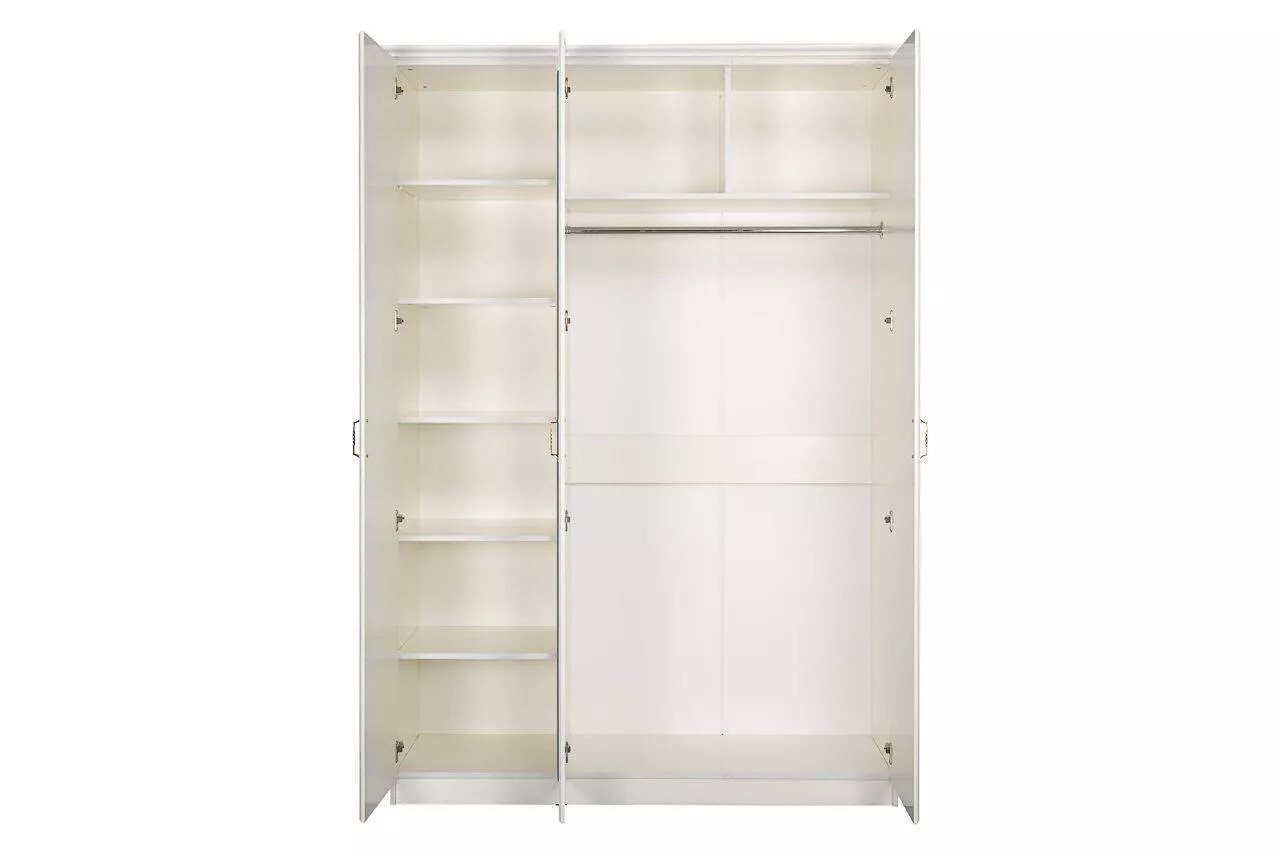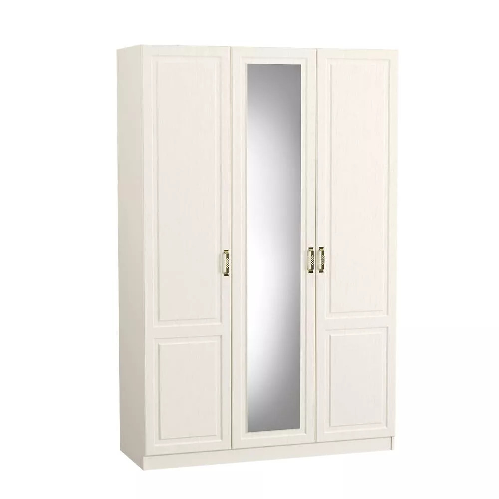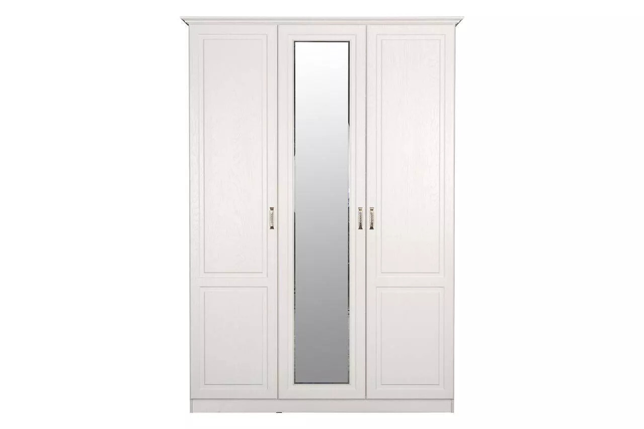 Трехдверный шкаф с зеркалом выполнен в светлой цветовой гамме и колониальном стиле визуально расширит пространство. Данная модель – отличное решение для организации гардеробной зоны в спальне. Большое зеркало установленное на центральную створку шкафа, позволит увидит себя в полный рост. Система хранения шкафа состоит из двух отделов с распашными дверцами. Большая секция представлен объемной нишей, в которой установлена штанга для вешалок, антресольная полка разделенная на два отсека для обуви или сумок. Второе отделение оборудовано множеством вместительных полок для размещения одежды, постельного белья.