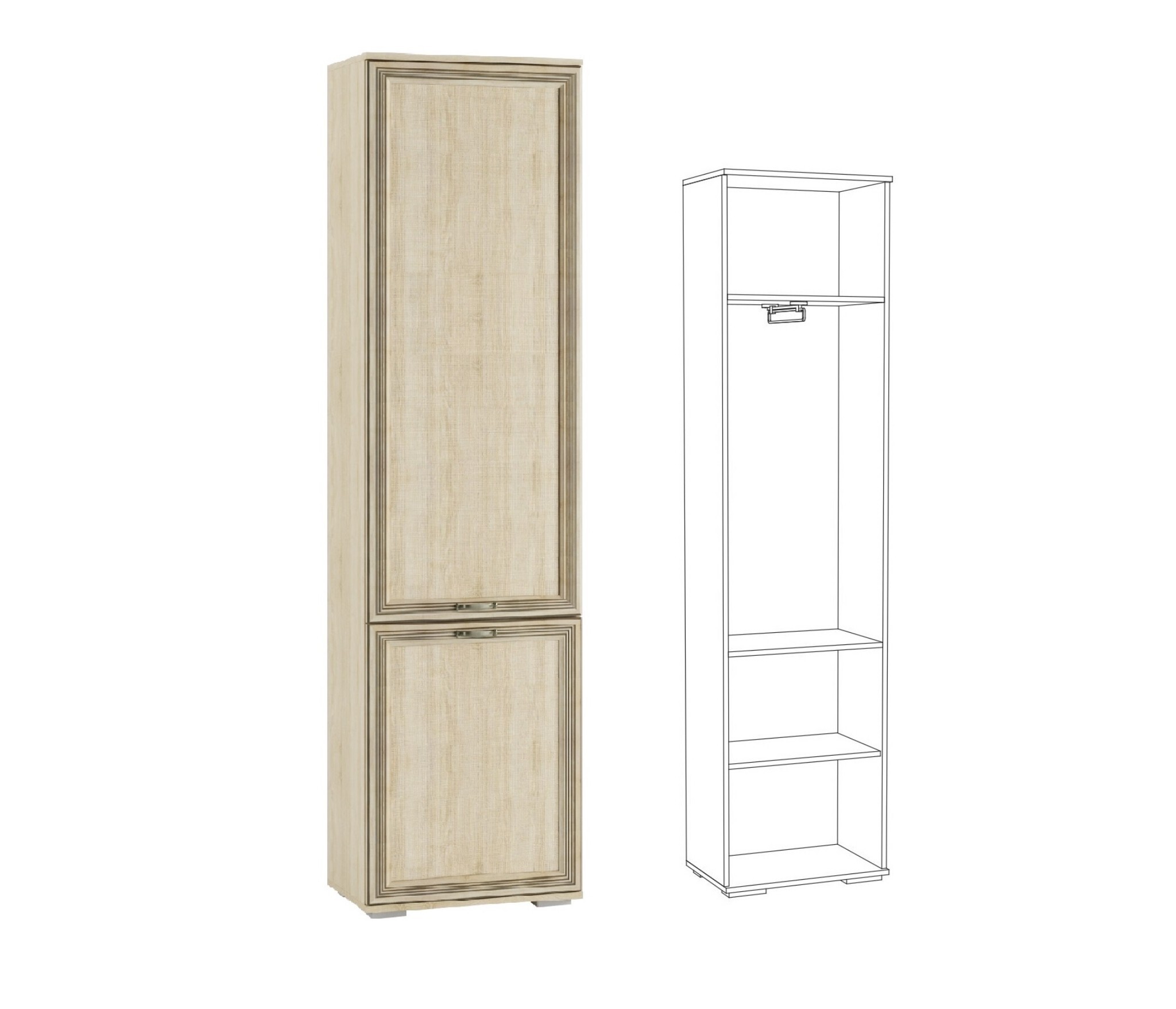 Хранить одежду в гостиной комнате становится возможным благодаря шкафу-пеналу ЛШ-2 из коллекции Ливорно. В комплекте - выдвижная штанга и 3 полки, благодаря чему вся Ваша одежда на плечиках и в сложенном виде будет содержаться в порядке. Тип штанги евро позволяет разместить большое количество вешалок даже в небольшой нише.Данный модуль отлично сочетается с другими шкафамиЛиворно.