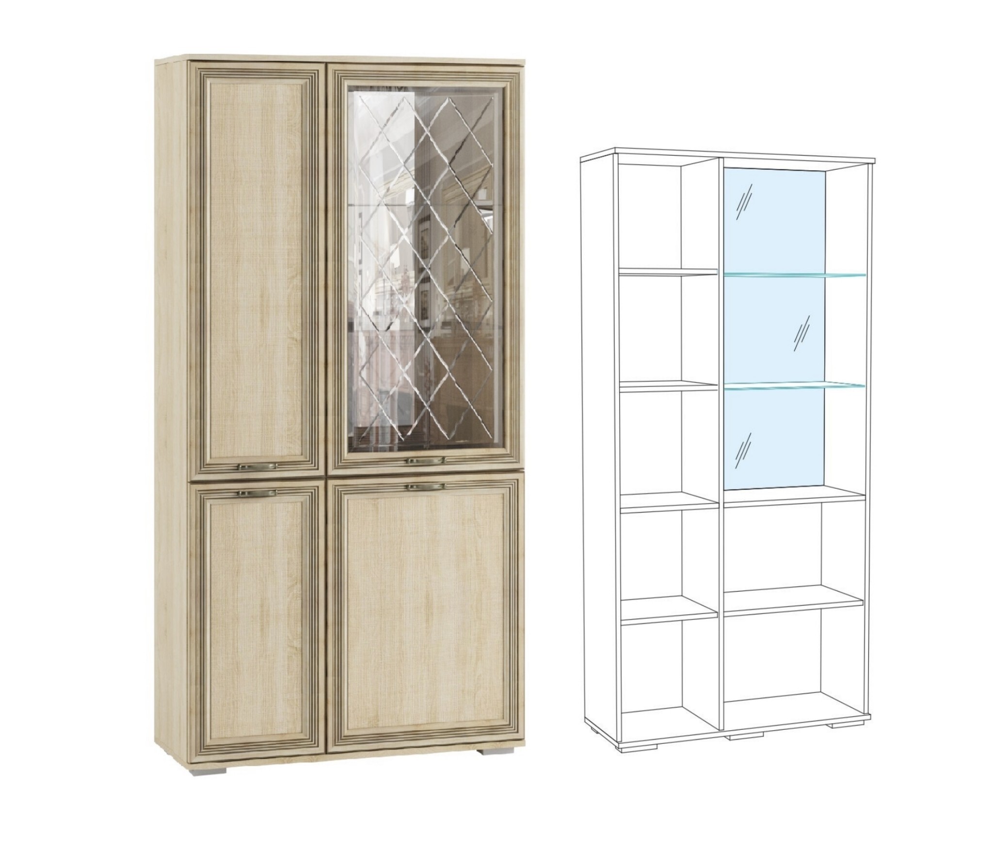 Какой модуль вместит в себя одновременно шкаф для одежды в сложенном виде и витрину для домашней утвари? Шкаф с полками и витриной из коллекции Ливорно! Секция за глухой дверью пригодится не только для хранения предметов одежды, но и книг, коробок и других вещей. Секция с комбинированным стеклянным фасадом будет идеальна для сервиза и предметов декора.Данный модуль отлично сочетается с другими шкафамиЛиворно.