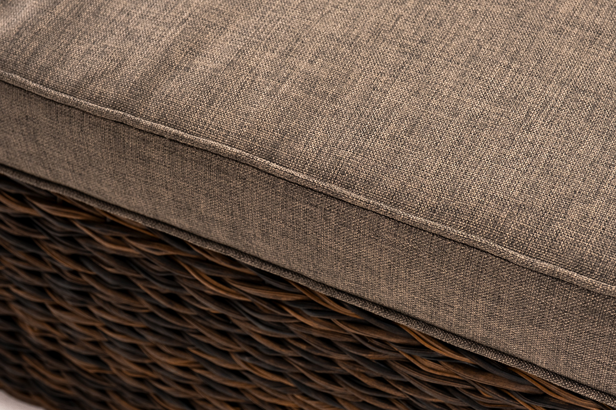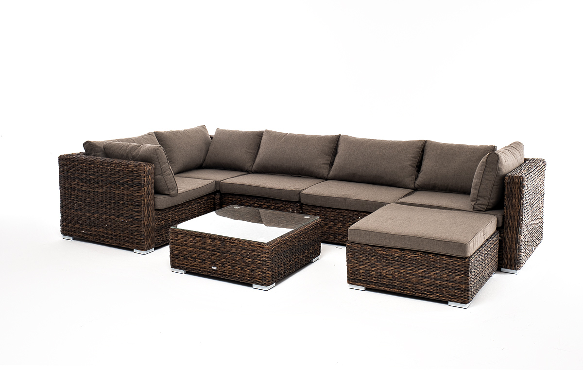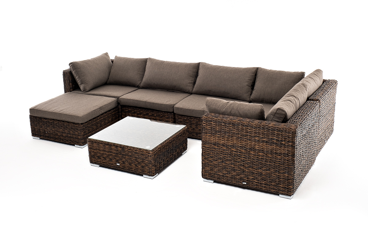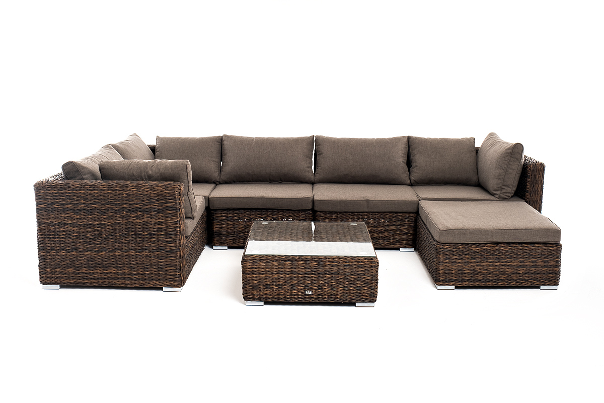 Облегченный алюминиевый каркас, вручную оплетенный искусственным ротангом натурального коричневого оттенка вида "гиацинт". Журнальный столик с прочной стеклянной столешницей толщин "Лунго" модуль диванный прямой с подушками, цвет коричневый (гиацинт) 2шт. 740Х860Х650, "Лунго" модуль диванный угловой с подушками, цвет коричневый (гиацинт) 3шт. 860Х860Х650, "Лунго" журнальный столик плетеный (гиацинт), цвет коричневый 1шт. 740Х740Х300, "Лунго" плетеная оттоманка с подушкой (гиацинт), цвет коричневый 1шт. 740Х740Х380,