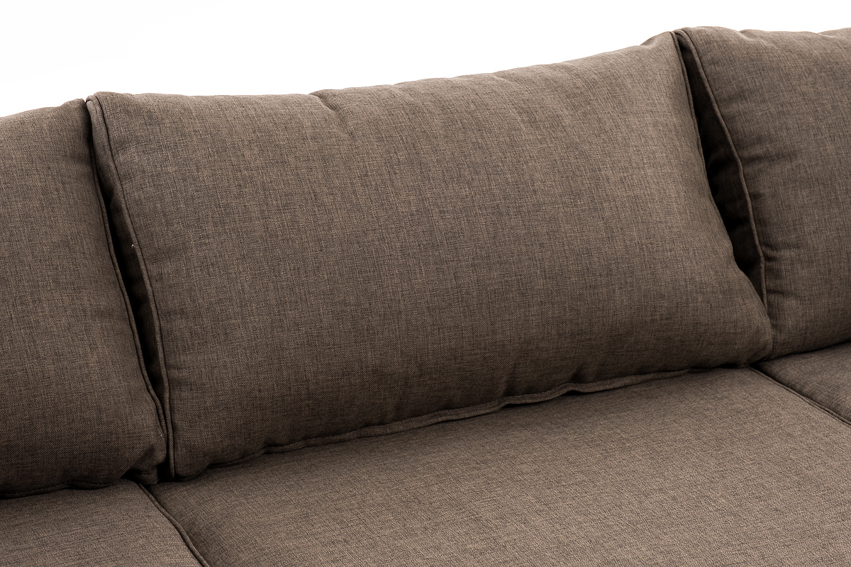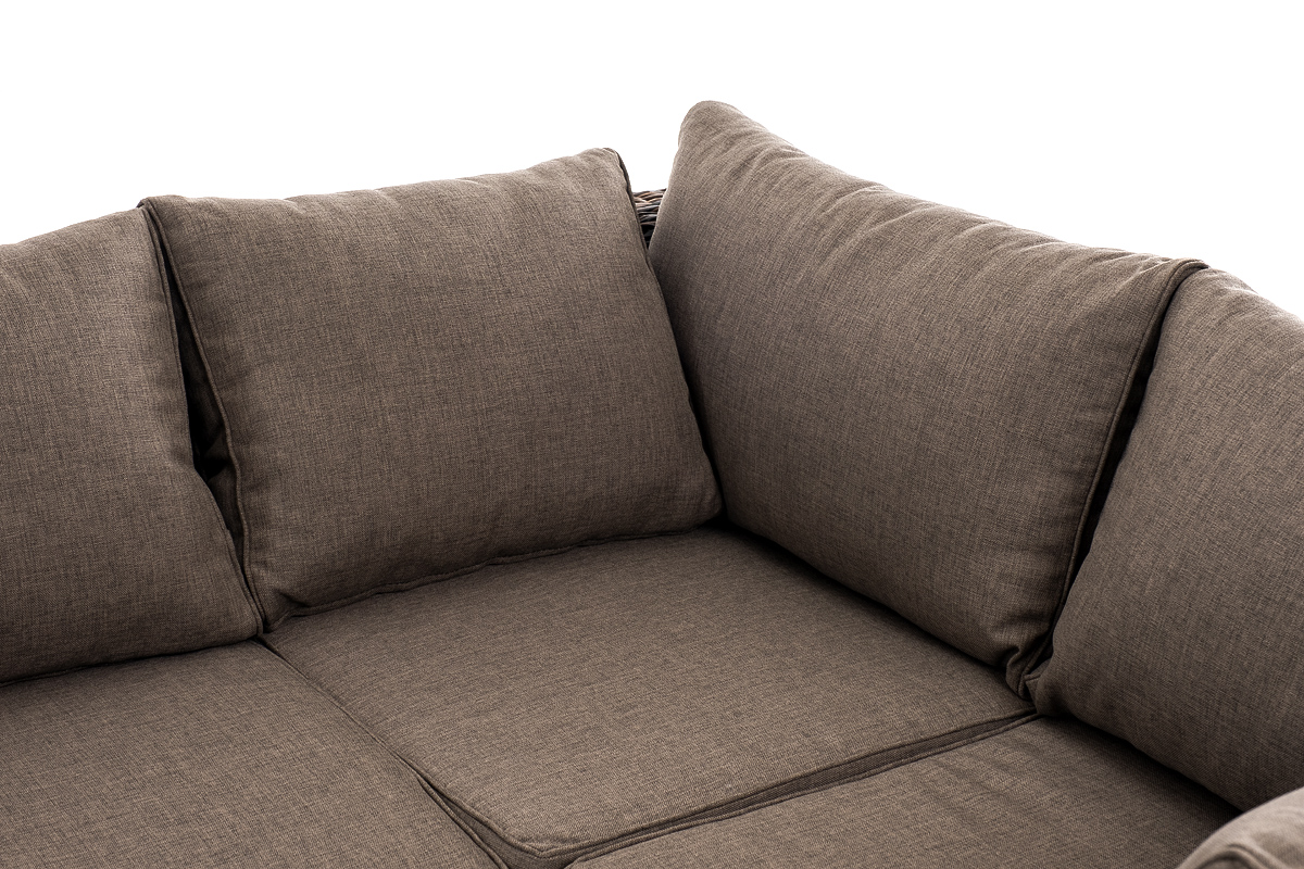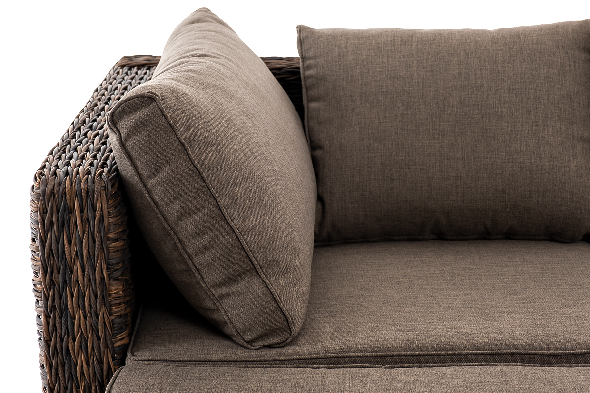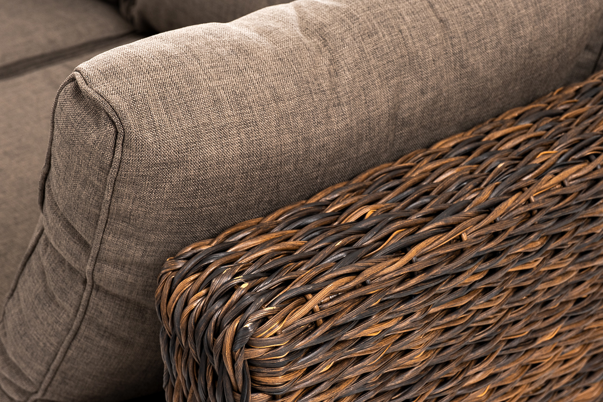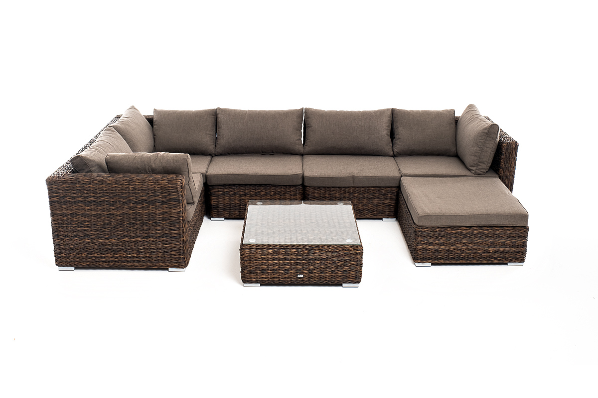 Облегченный алюминиевый каркас, вручную оплетенный искусственным ротангом натурального коричневого оттенка вида "гиацинт". Журнальный столик с прочной стеклянной столешницей толщин "Лунго" модуль диванный прямой с подушками, цвет коричневый (гиацинт) 2шт. 740Х860Х650, "Лунго" модуль диванный угловой с подушками, цвет коричневый (гиацинт) 3шт. 860Х860Х650, "Лунго" журнальный столик плетеный (гиацинт), цвет коричневый 1шт. 740Х740Х300, "Лунго" плетеная оттоманка с подушкой (гиацинт), цвет коричневый 1шт. 740Х740Х380,