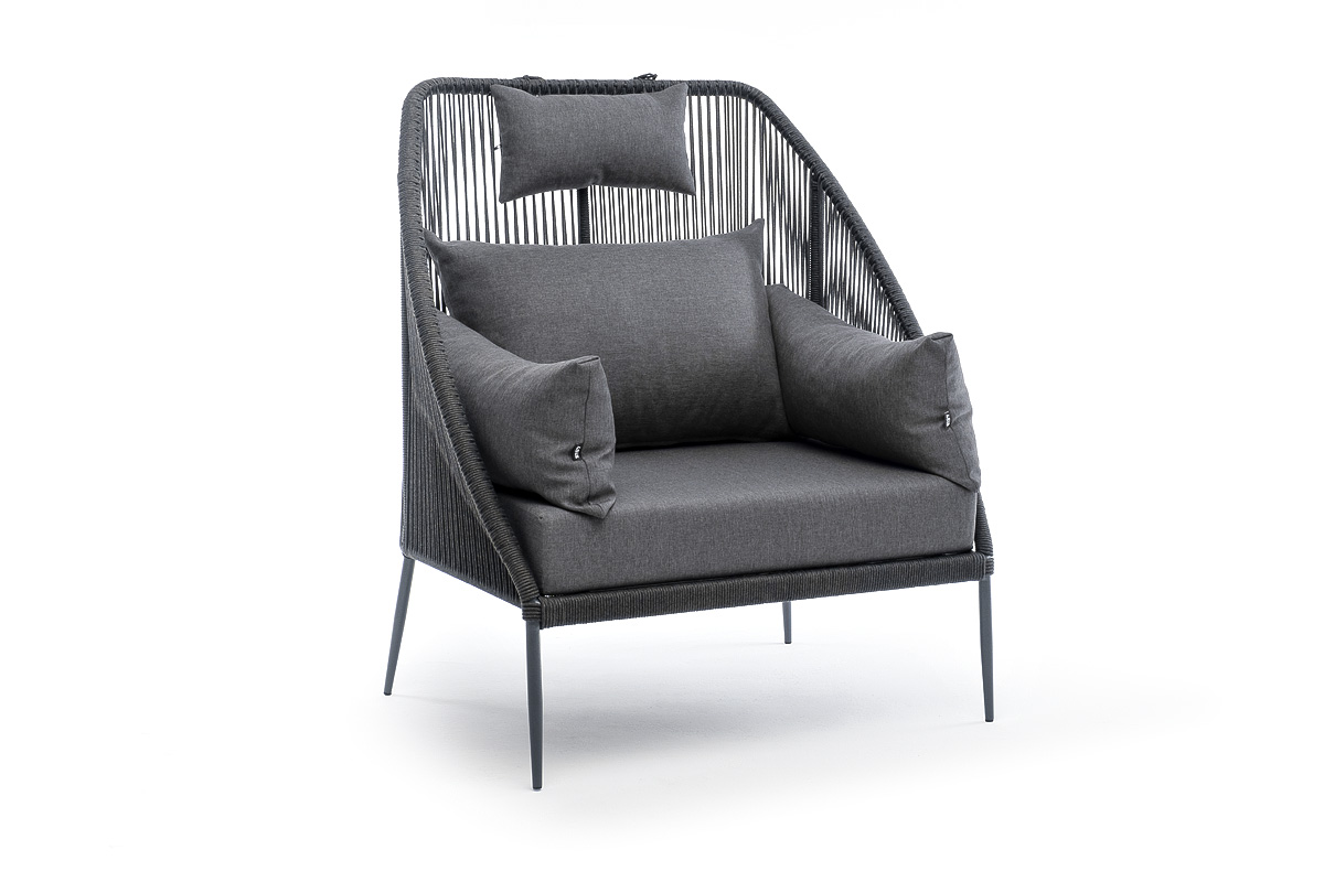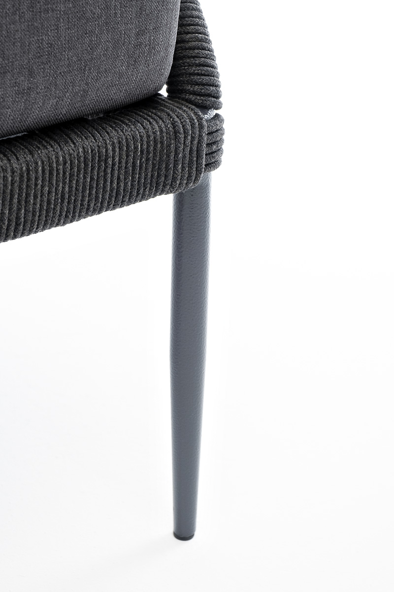 Кресло имеет алюминиевый каркас, окрашенный порошковой краской в темно-серый (RAL7024) цвет. Боковины каркаса вручную оплетены роупом - эластичными синтетическими лентами, изготовленными из высокопрочных полиэфирных волокон. Цвет оплетки - темно-серый.