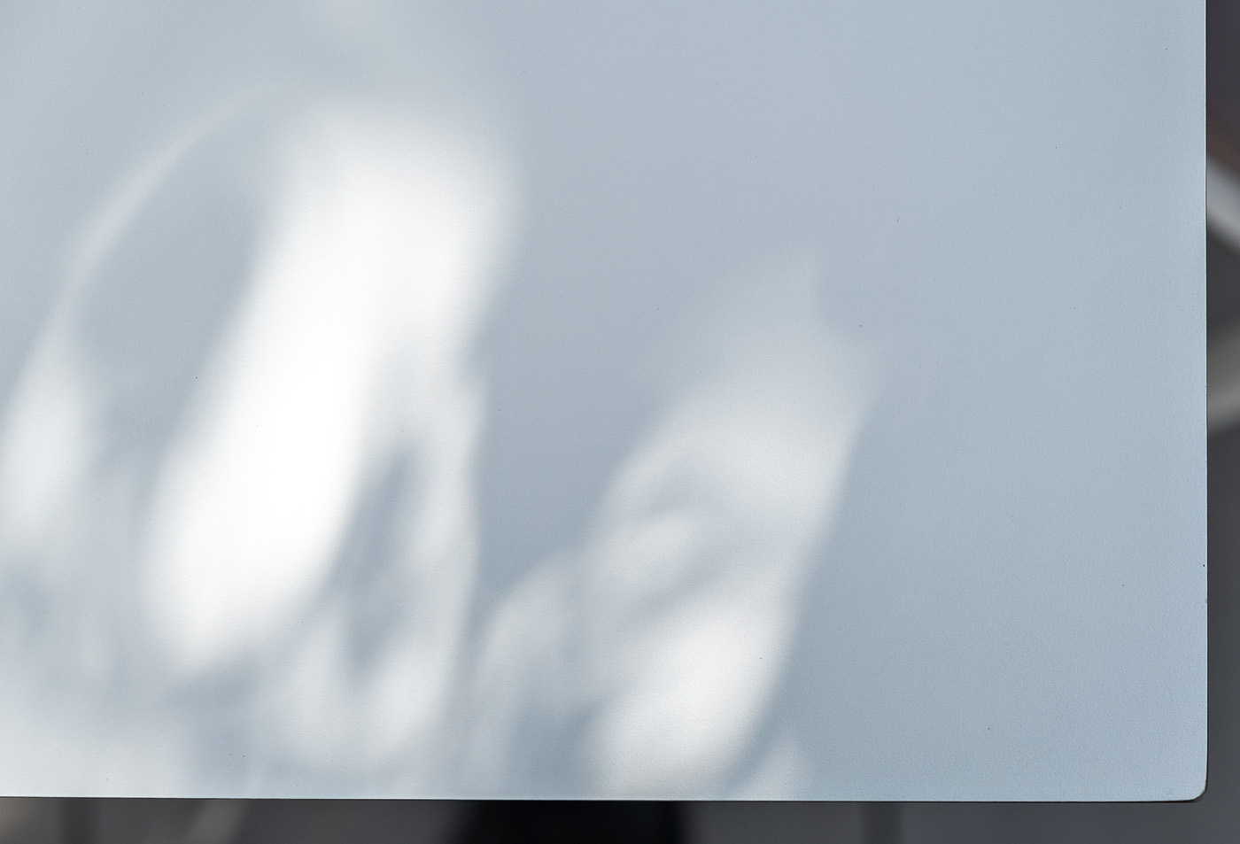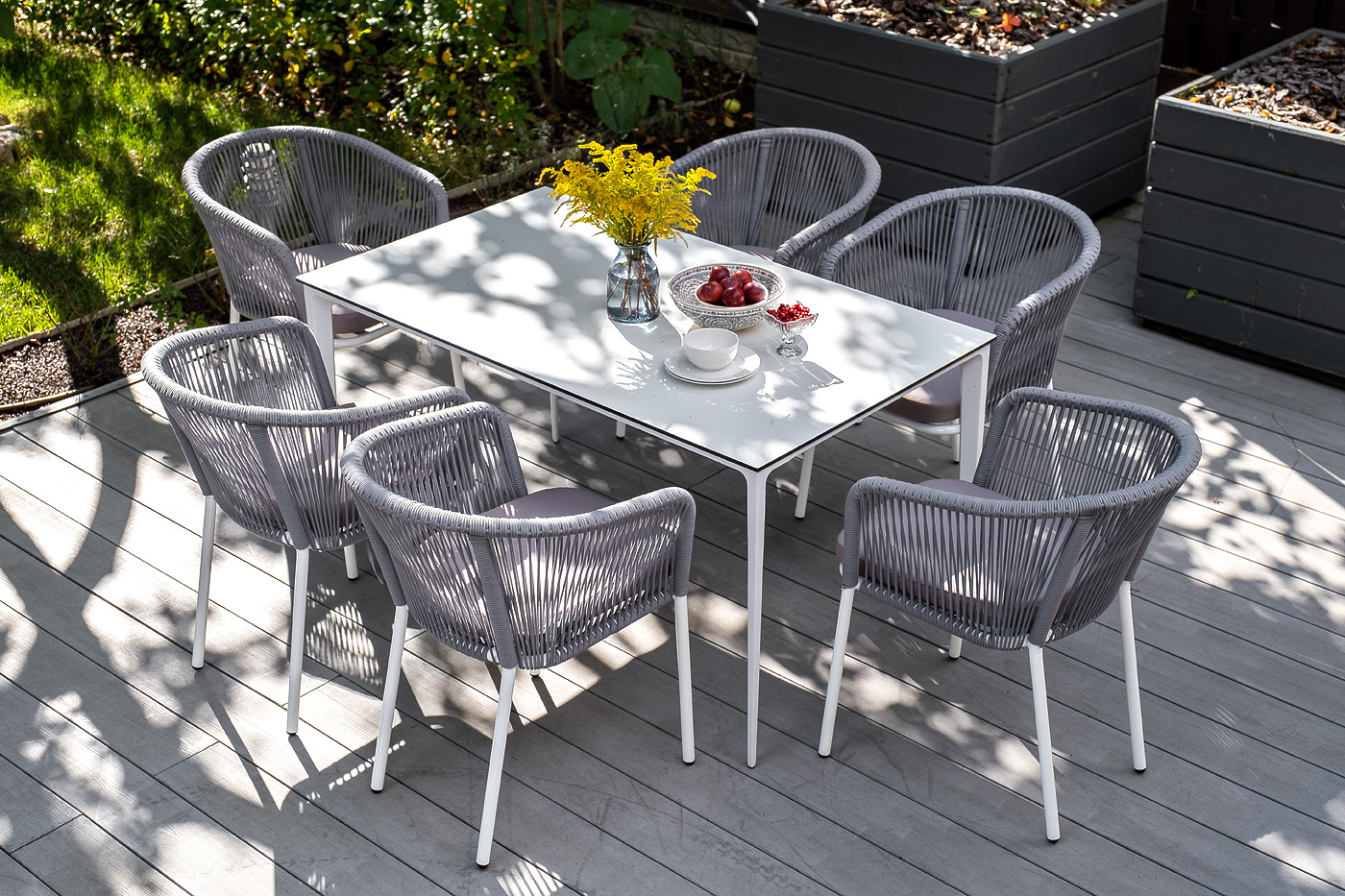 Столешница выполнена из современного высококачественного монолитного компакт-пластик HPL, толщиной 12 мм в молочном цветом. Материал устойчив к высоким температурам, попаданию влаги и может использоваться при любых погодных условиях. Подстолье изготовлено из крашеного алюминия белого цвета.