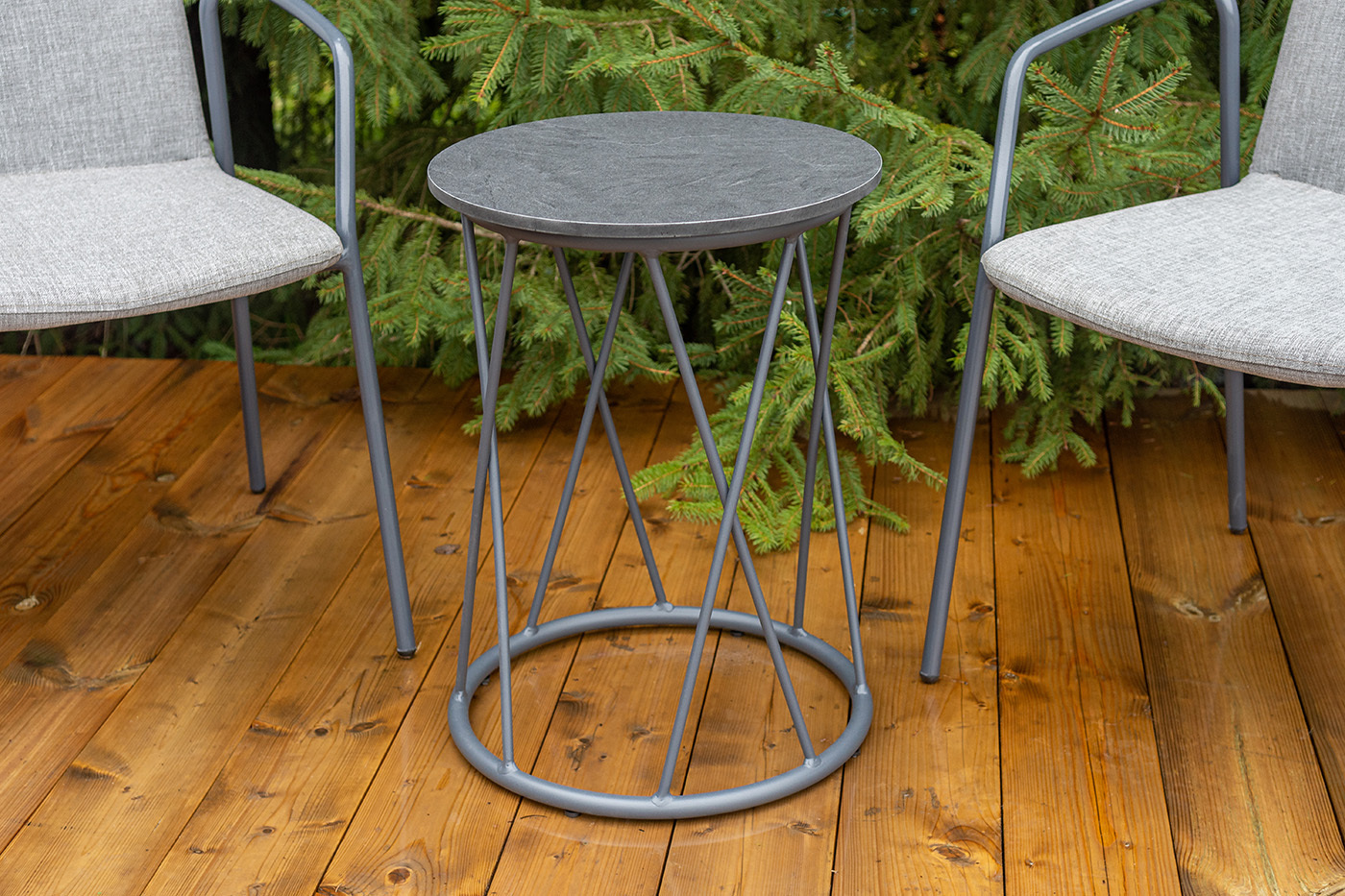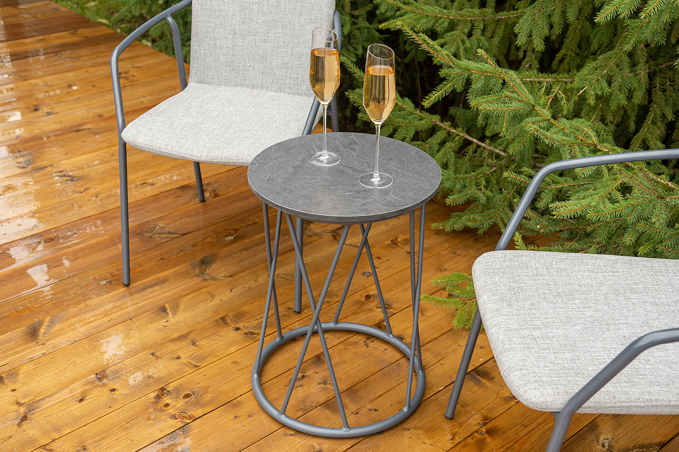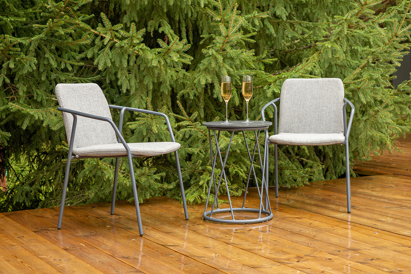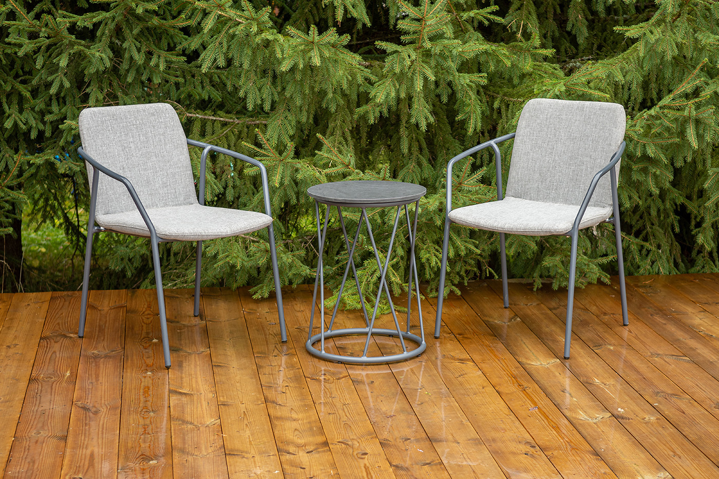В комплект входят два стула «Марокко» (575×600×800 мм) из текстилена Nanotex с алюминиевым каркасом в темно‑сером цвете (RAL7024) и круглый журнальный столик «Колумбия» (400×400×550 мм) с алюминиевым каркасом и столешницей из монолитного компакт‑пластика HPL (12 мм) в оттенке «серый гранит».