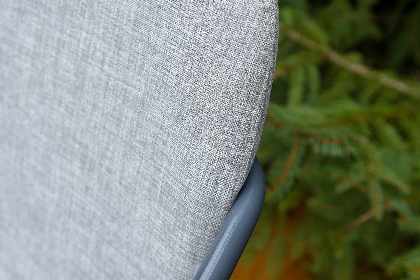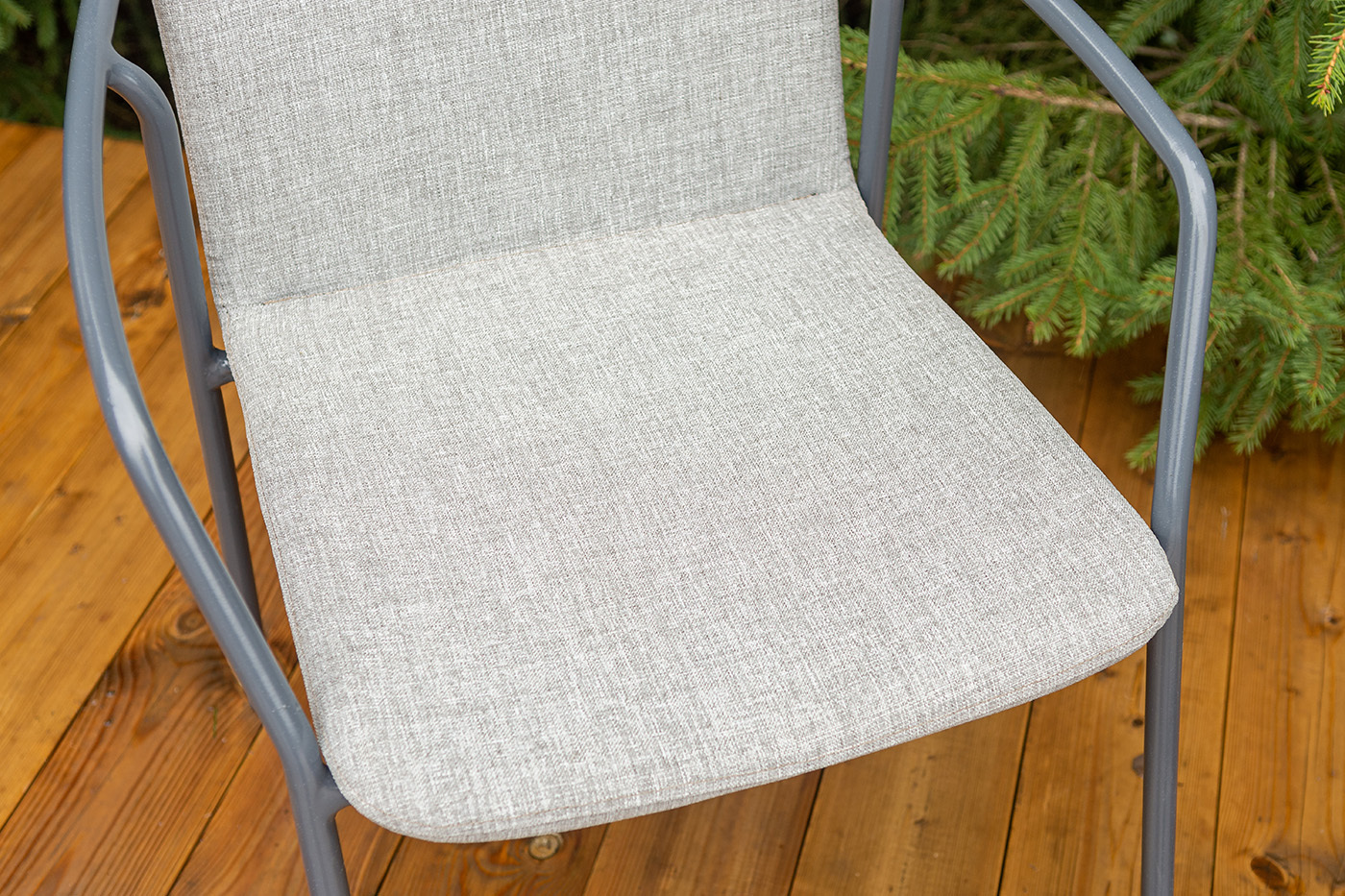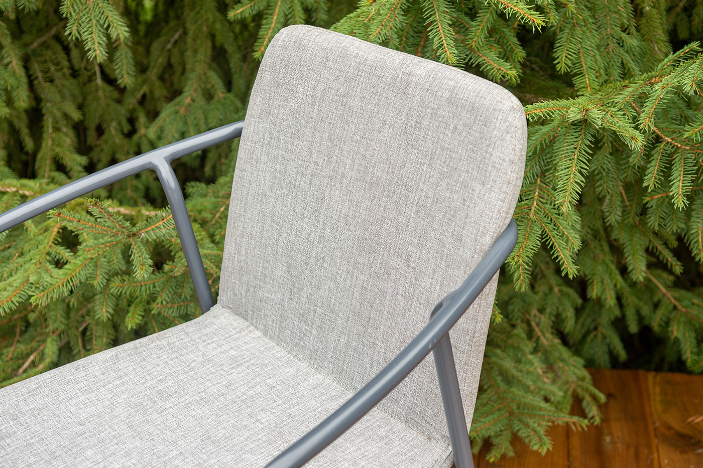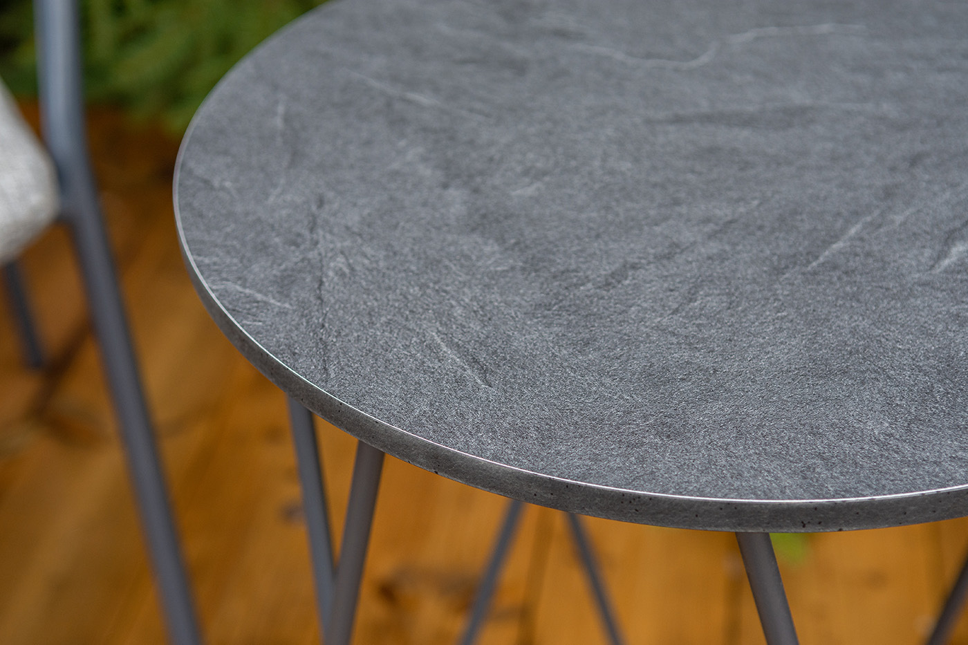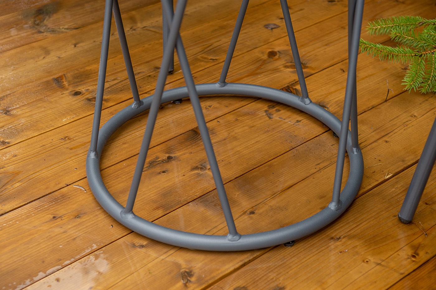 В комплект входят два стула «Марокко» (575×600×800 мм) из текстилена Nanotex с алюминиевым каркасом в темно‑сером цвете (RAL7024) и круглый журнальный столик «Колумбия» (400×400×550 мм) с алюминиевым каркасом и столешницей из монолитного компакт‑пластика HPL (12 мм) в оттенке «серый гранит».