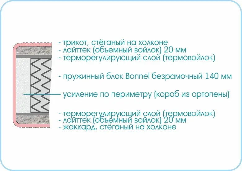 Матрас Люкс Стандарт ниже средней жесткости на основе классического пружинного блока Bonnell, который обеспечивает надежную поддержку позвоночника. В качестве наполнителя используется лайттек.