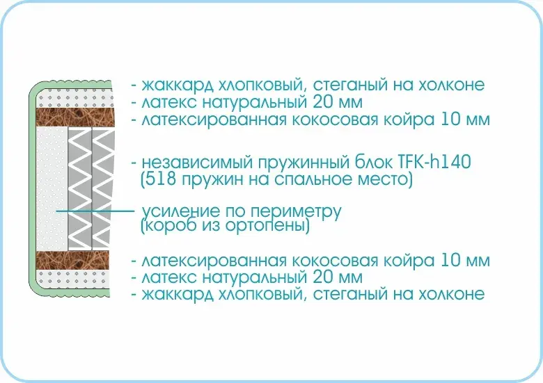 В его основании – независимый пружинный блок, где каждая пружина идеально подстраивается под вес и форму тела человека во время сна. Пружинный блок идеально сочетается с натуральными материалами, находящимися в соотношении 1 к 2, а именно: 1 см кокосовой койры с латексной пропиткой и 2 см натурального латекса.