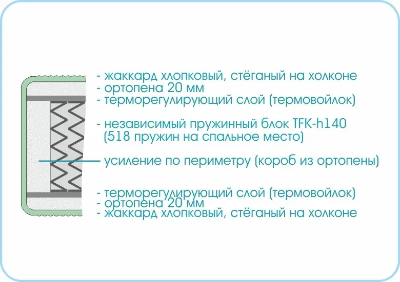 Прочный терморегулирующий слой устойчив к истиранию, что существенно продлевает срок службы изделия. Слой упругой ортопены улучшает анатомические свойства матраса, повторяя контуры тела спящего. Вы прекрасно выспитесь и утром будете чувствовать себя отлично!