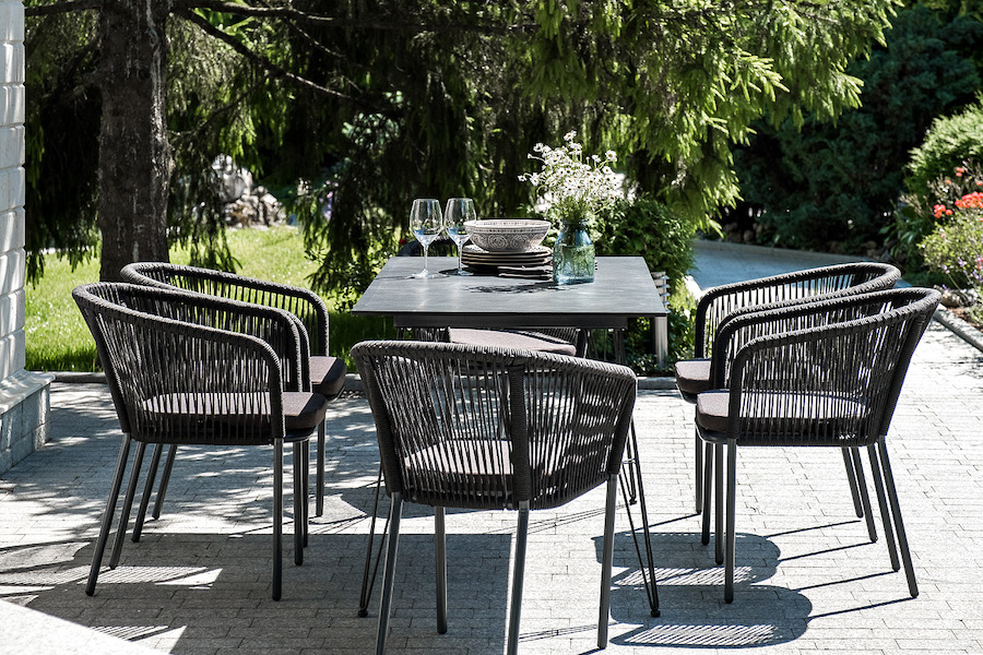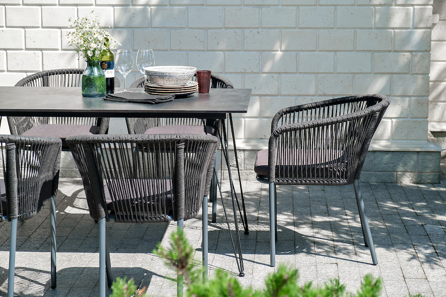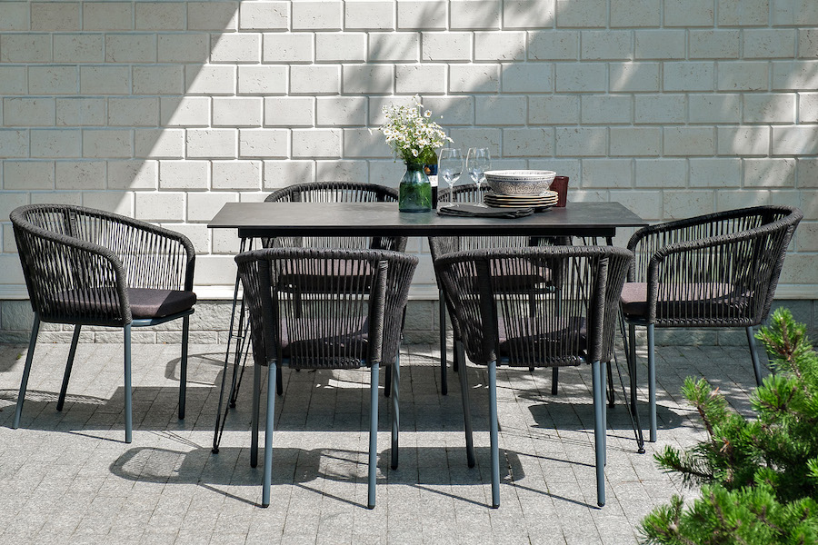 Каркас стульев - алюминиевый, оплетен вручную современным материалом - роупом. Это эластичные синтетические ленты из высокопрочных полиэфирных волокон. В комплект "Руссо" обеденный стол из HPL 150х80см, цвет "черный мрамор" 1шт. 1 500Х800Х750, "Марсель" стул плетеный из роупа, каркас алюминий темно-серый (RAL7024) муар, роуп темно-серый круглый, ткань темно-серая 027 6шт. 570Х620Х775,