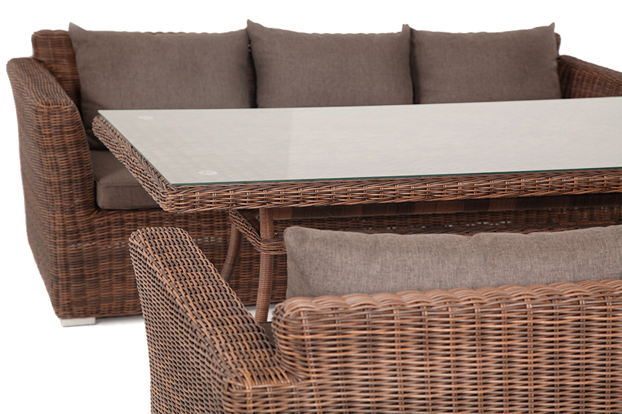 Каркас всех предметов изготовлен из алюминия, поэтому их легко перемещать. В качестве декора использован искусственный ротанг круглого ручного плетения, устойчивый к УФ лучам, сырости, перепадам температуры. На сидениях и спинках диванов предусмотрены мягкие под "Капучино" диван из искусственного ротанга трехместный, цвет коричневый 2шт. 2 220Х865Х815, "Латте" плетеный стол из искусственного ротанга 200х90см, цвет коричневый 1шт. 2 000Х900Х750,