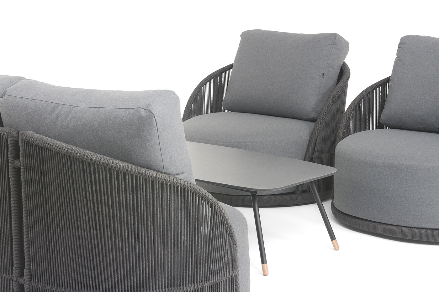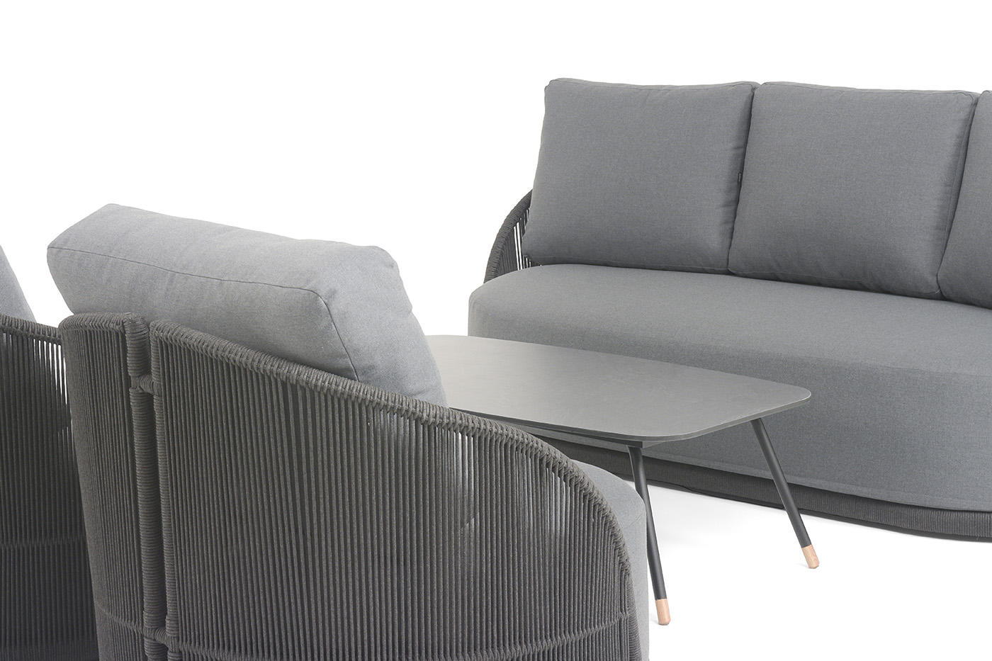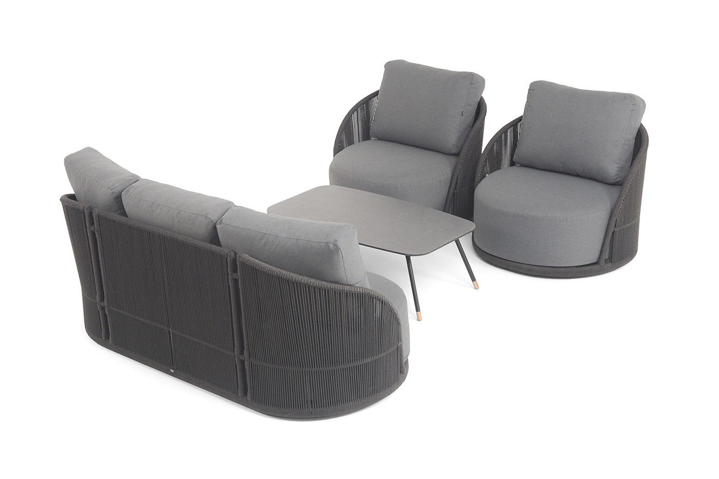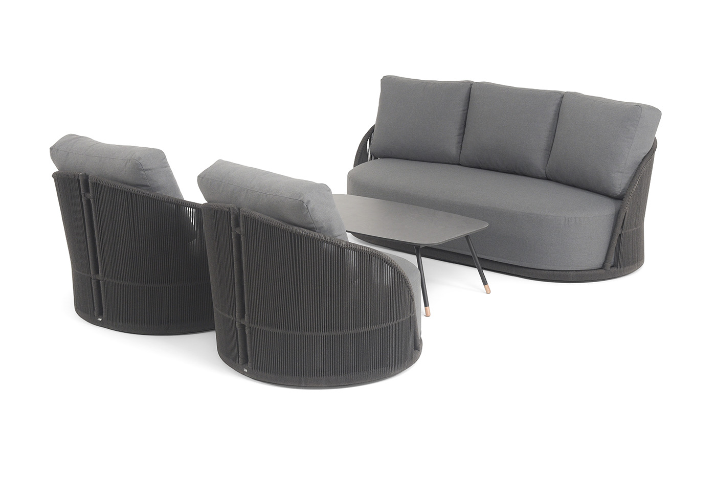 Кресла и диван идут в комплекте с мягкими подушками в чехлах "Монтелла" диван 3-местный плетеный из роупа, каркас алюминий темно-серый (RAL7024) муар, роуп темно-серый круглый, ткань темно-серая 027 1шт. 2 060Х925Х805, "Монтелла" кресло плетеное из роупа, каркас алюминий темно-серый (RAL7024) муар, роуп темно-серый круглый, ткань темно-серая 027 2шт. 1 040Х925Х81, "Верона" журнальный стол из HPL 120х65, H40, каркас темно-серый (RAL7024) муар, цвет столешницы "серый гранит" 1шт. 1 200Х650Х400,