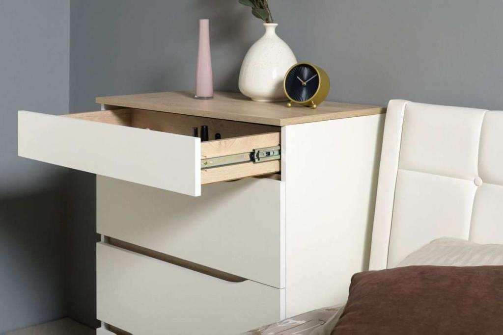 Комод из спального гарнитура Муссон можно приобрести отдельно. У комода современный ручки, вернее их нет, ящики открываются за край. У ящиков шариковые направляющие полного выдвижения. Комод стоит на регулируемых опорах.