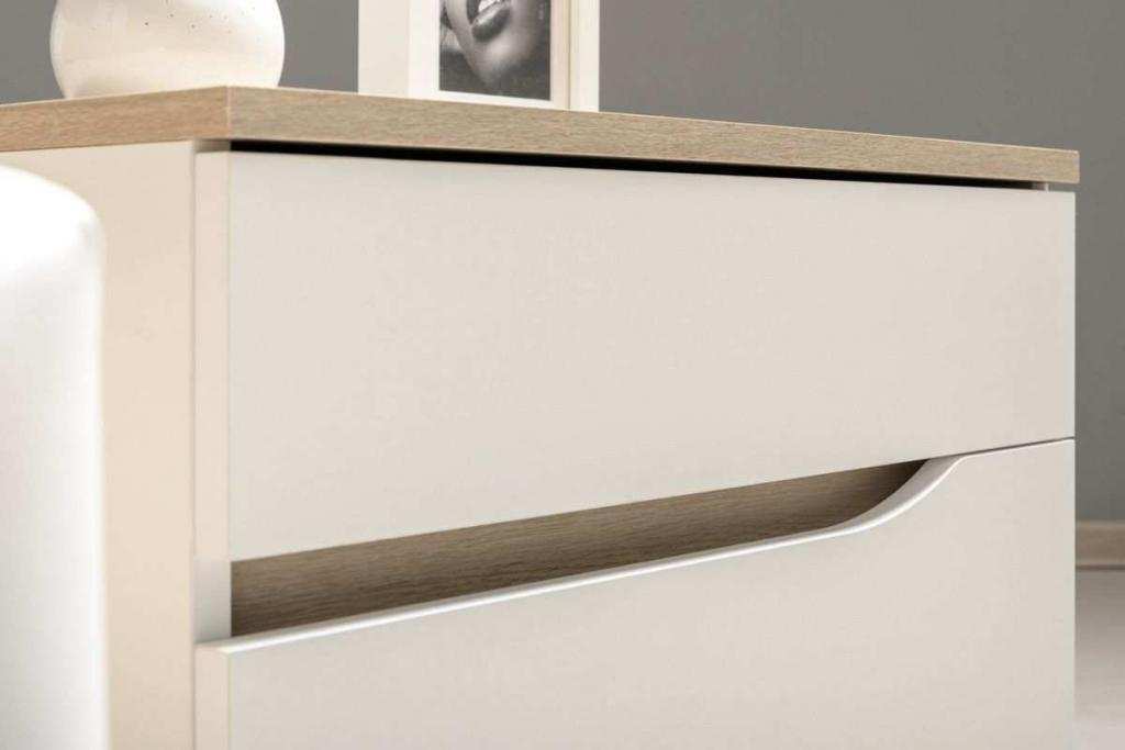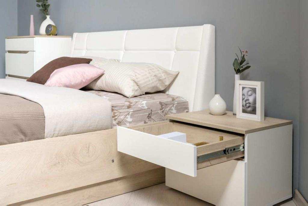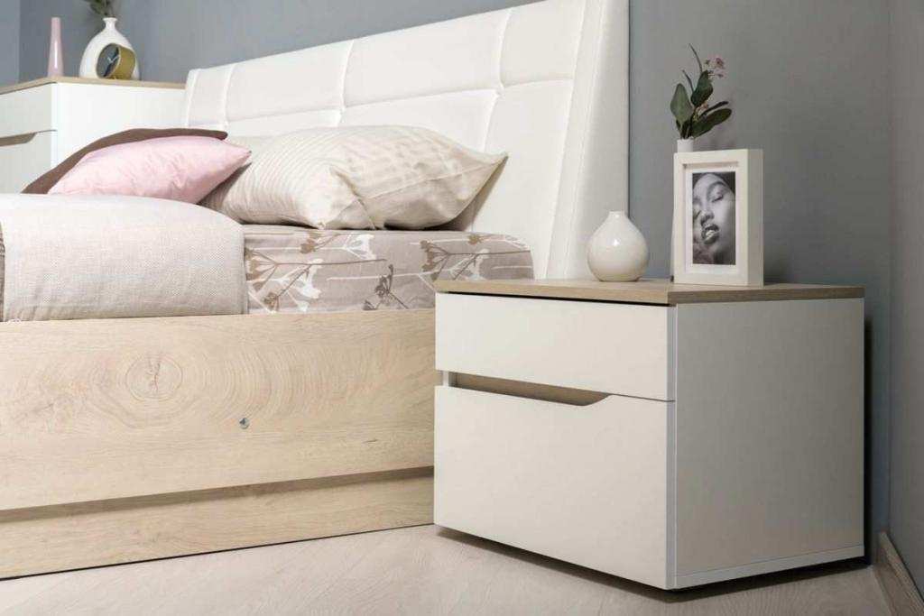 Прикроватная тумбочка станет прекрасным дополнением к кровати. Тумба стоит на регулируемых опорах. Ящики открываются за край, благодаря ручке-вырезу. Ящики на шариковых направляющих полного выдвижения.
