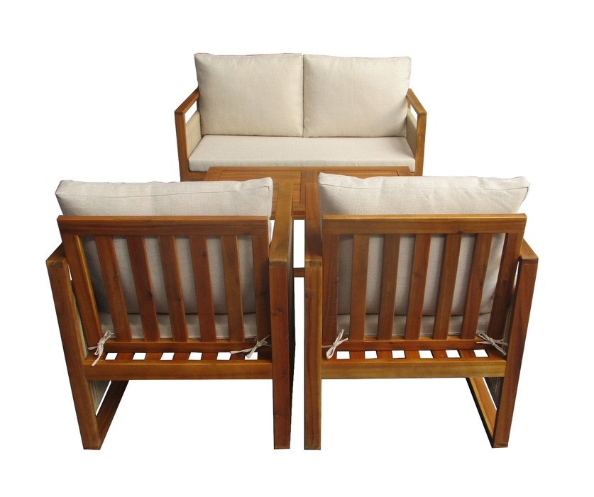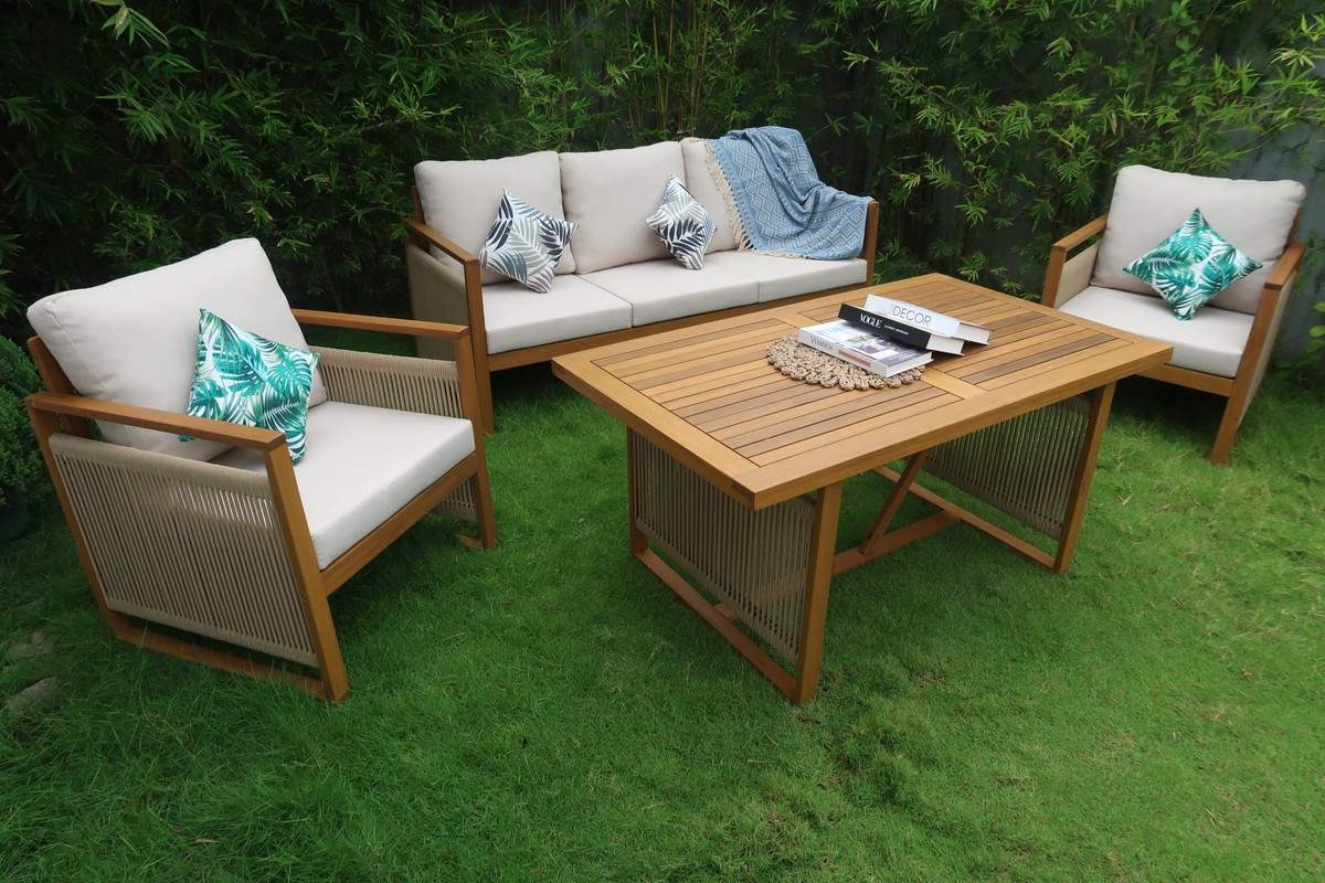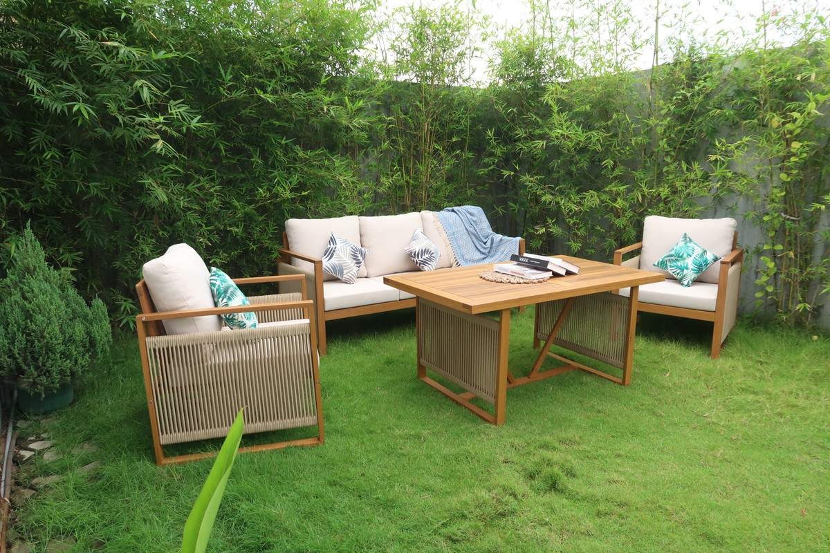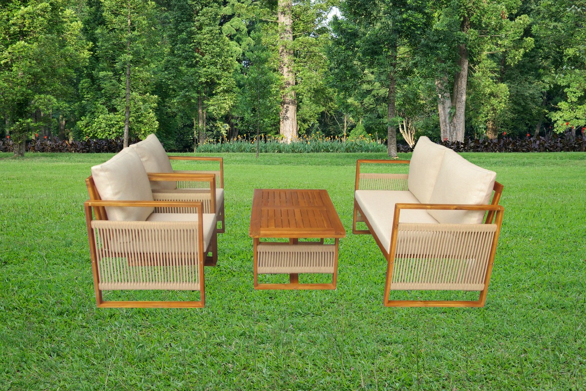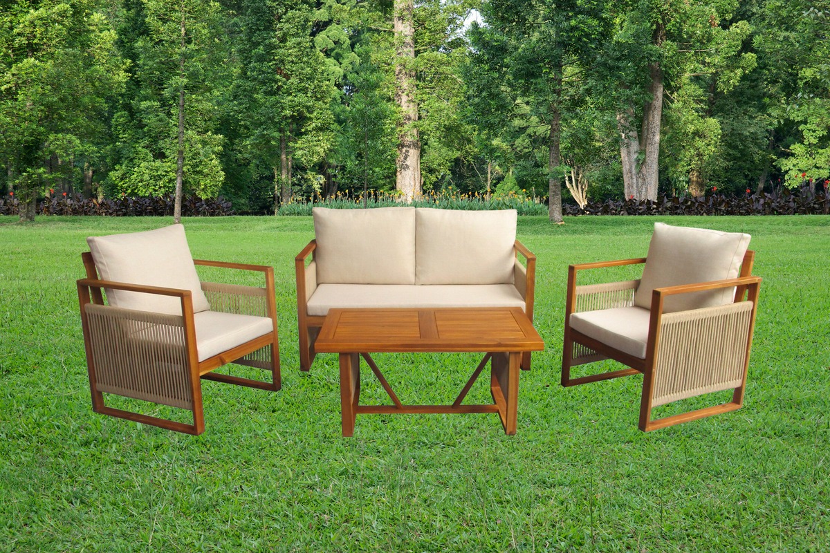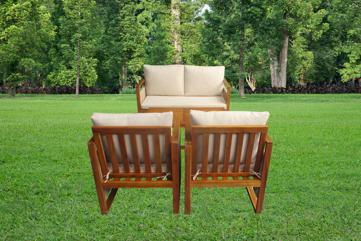 Набор садовой мебели позволяет создать уголок отдыха на загородном участке. Четыре предмета создают функциональный ансамбль в едином стиле. Изготовлен из древесины акации. Материал устойчив к внешним воздействиям, влаге и насекомым — повышенный срок эксплуатации. Легко содержать в чистоте — необходимо периодически протирать влажной тканью. Подходит для использования в саду, на открытой веранде или у бассейна.