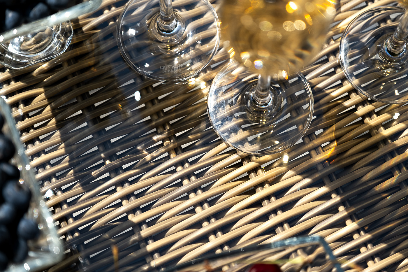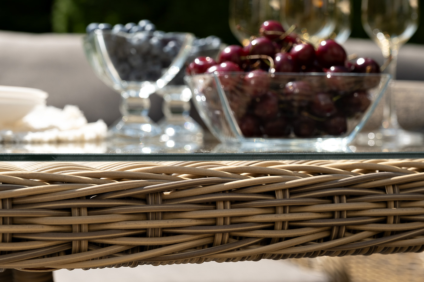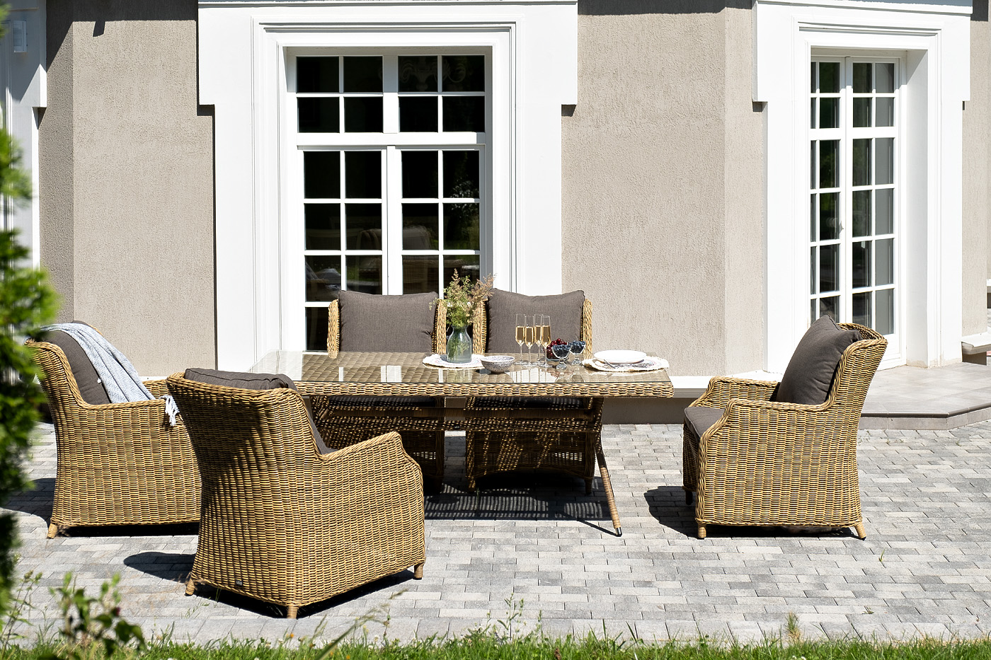 Каркас всех изделий выполнен из легкого и долговечного алюминия, оплетенного вручную круглым искусственным ротангом натурального соломенного цвета.