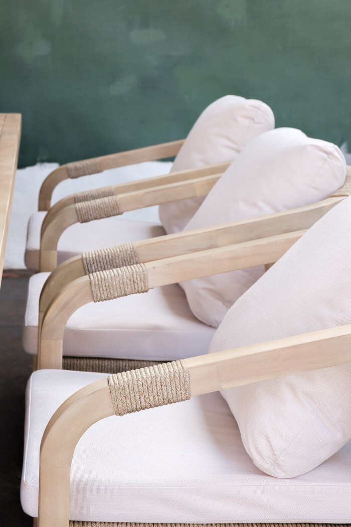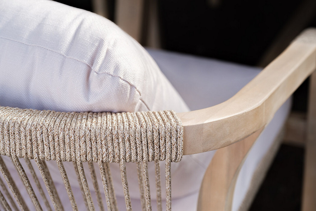 РИМИНИ – современная коллекция садовой мебели из акации, выполненная в комбинации натурального веревочного плетения rope, массива акации и бежевых подушек.
