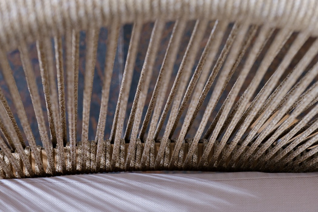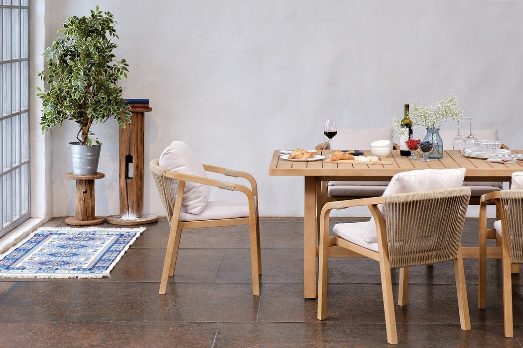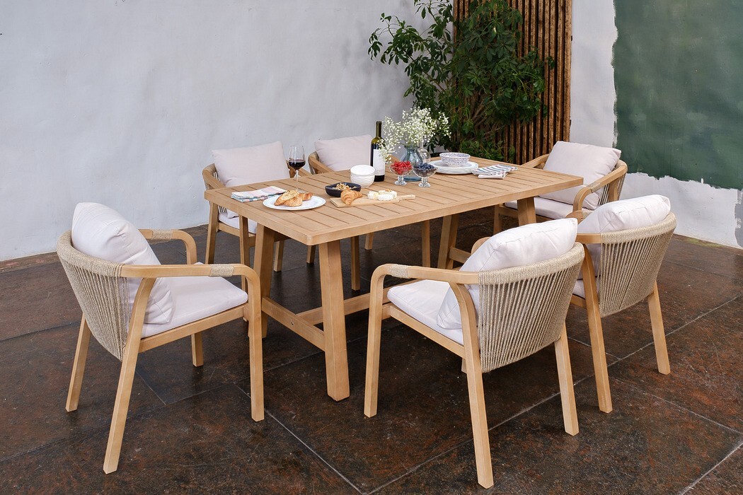 РИМИНИ – современная коллекция садовой мебели из акации, выполненная в комбинации натурального веревочного плетения rope, массива акации и бежевых подушек.
