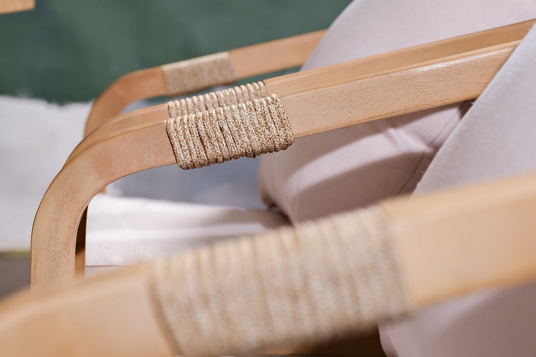 Материал — массив акации, отделка экомаслом светлый тик, веревочное плетение роуп