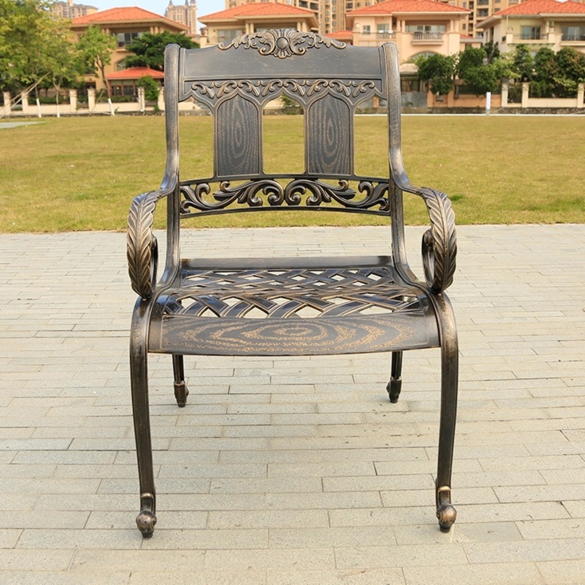 Обеденный комплект из литого алюминия вмещает за собой большое количество людей. Массивная ножка делает стол устойчивым как на плитке так и на траве. Литой алюминий отлично подойдет для загородного дома, на улице металл не ржавеет , гармонично смотрится с окружающей природой.