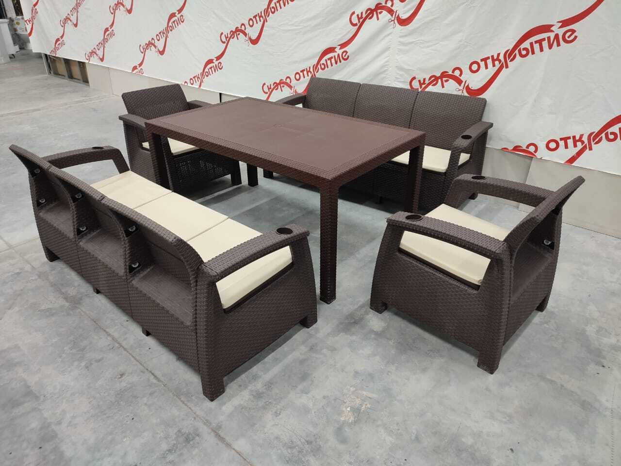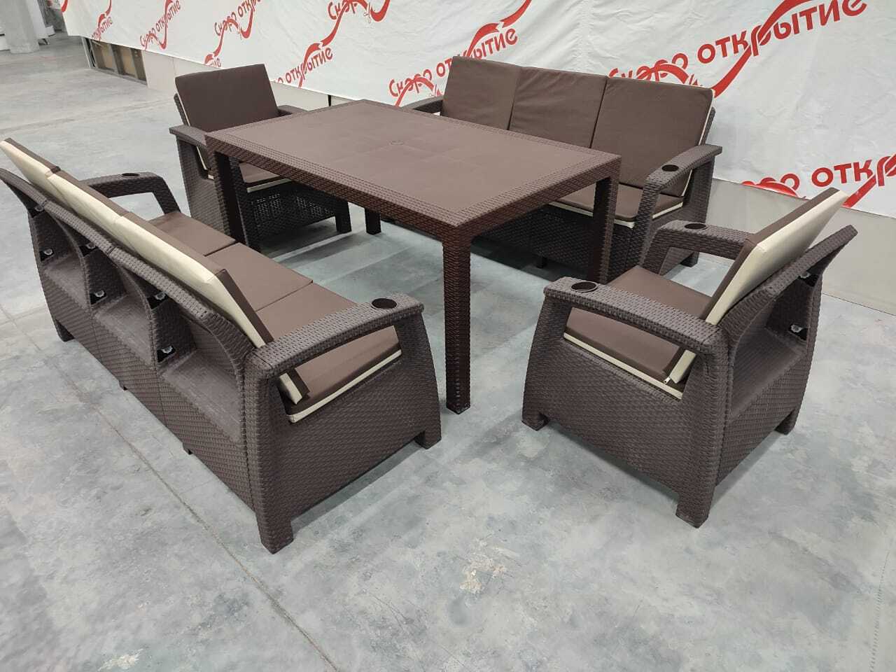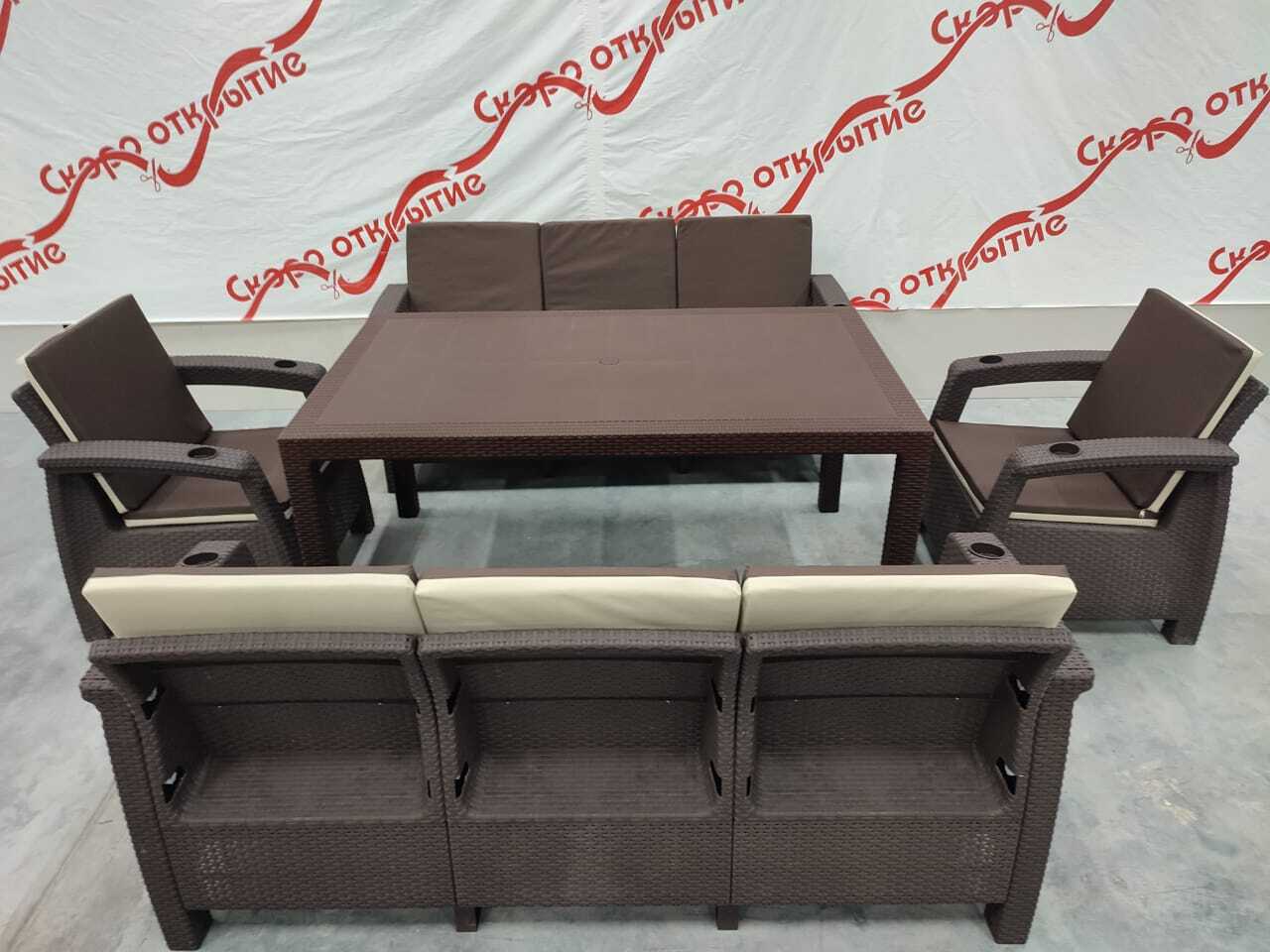 Обеденный комплект под ротанг YALTA FAMILY MAXI SET под ротанг имеет стильный и современный внешний вид, гармонично впишется в интерьер кафе, баров и ресторанов, а также для зоны отдыха вашего загородного дома, или дачи. В разобранном виде занимает мало места, легко собирается и разбирается, удобный в перевозки и хранении. В подлокотниках встроены специальные подстаканники. . Прочный всепогодный плетёный пластик, устойчивый к выгоранию. Долговечная неметаллическая рама: не гниёт, не ржавеет. Пластик – полипропилен. Инструкция по сборки в комплекте.