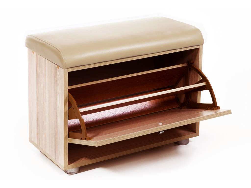 Конструкция с мягким сиденьем и откидной секцией для хранения обуви.