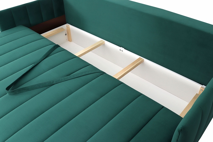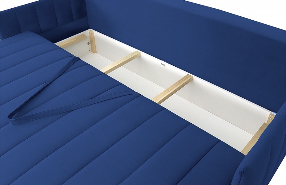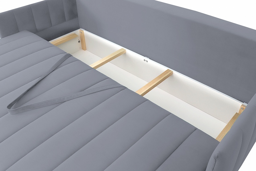 Диван удачно зонирует пространство и дополняет необходимым функционалом. В основании спального места блок независимых пружин для комфортного сна. Вместительный ящик для хранения постельных принадлежностей.