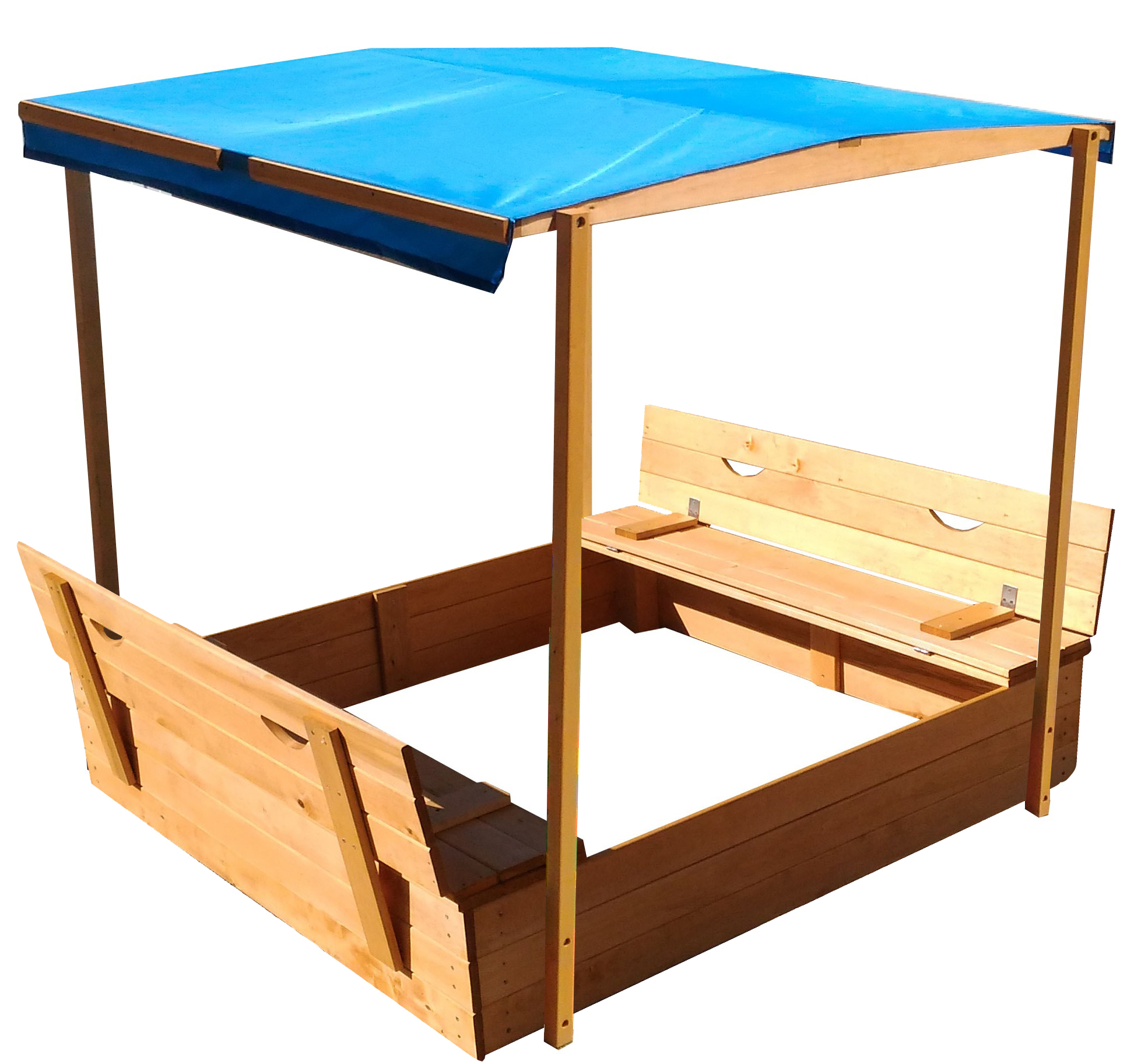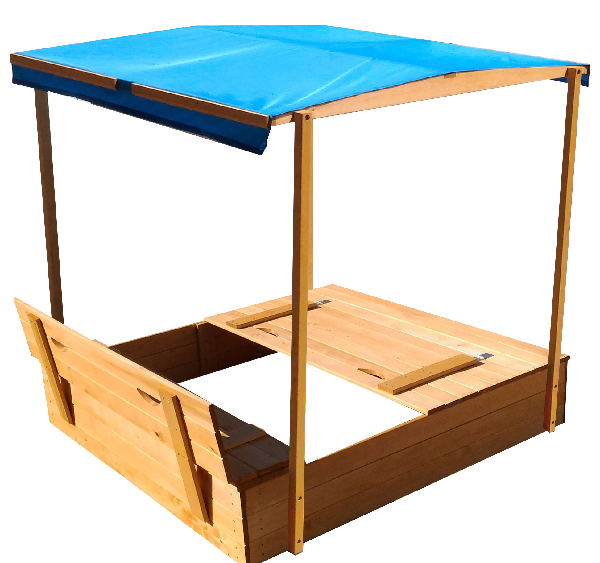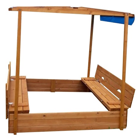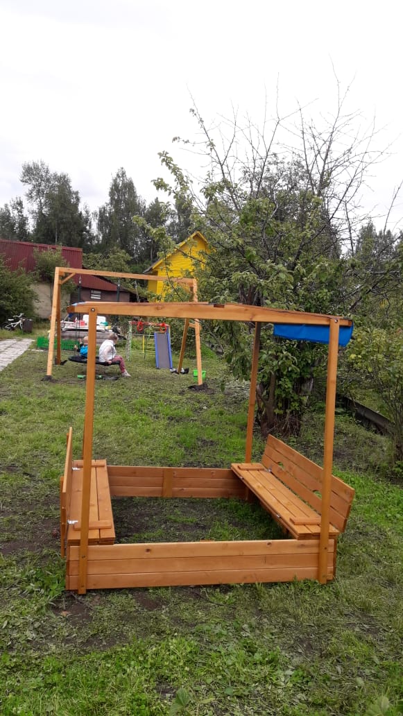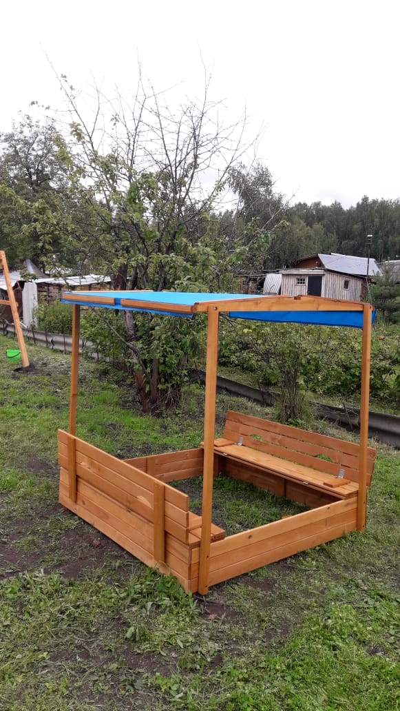 Песочница изготовлена из прочной сосны и отличается долгим сроком службы благодаря пропитке антисептиком.