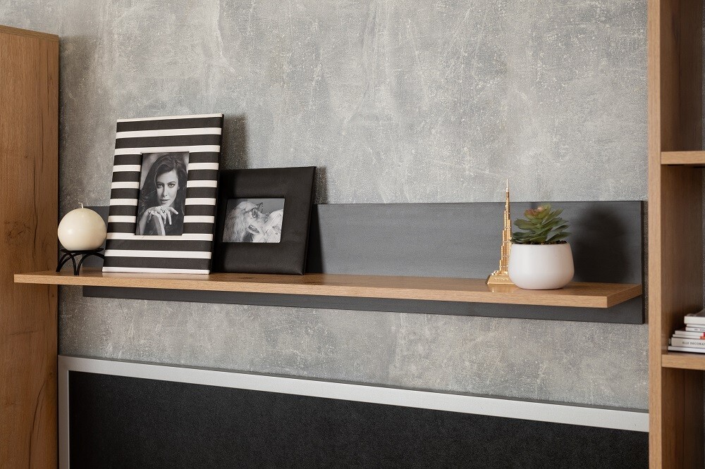 Навесная полка Crown дополнит основной мебельный гарнитур в гостиной. Расположите ее над тумбой под телевизор, чтобы декорировать пространство и иметь еще больше места для предметов декора, книг и памятных вещиц. Полка дополнит интерьер гостиной и будет притягивать взгляды гостей своей легкостью и простотой конструкции.