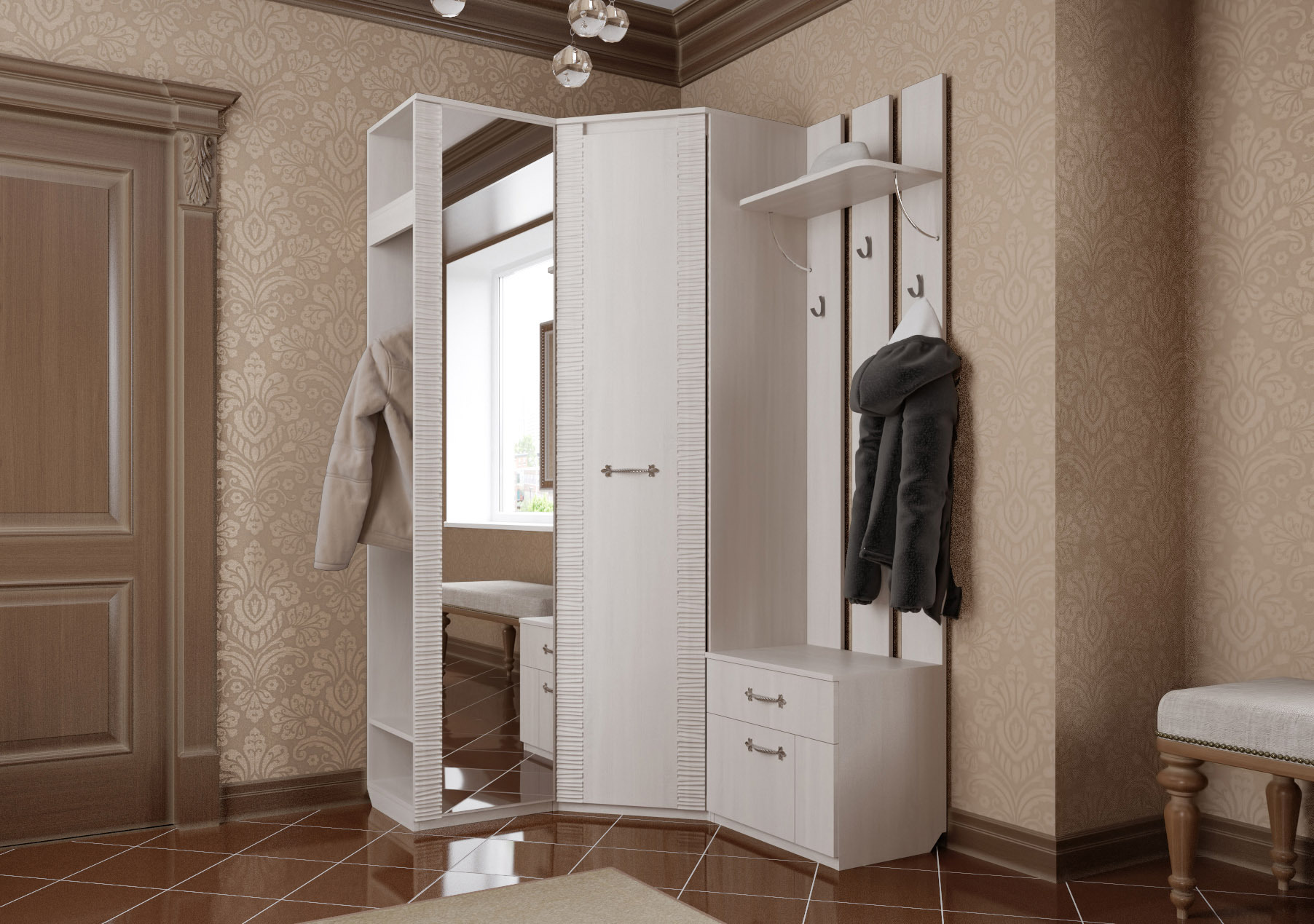 Создатели данной прихожей пошли на маленькую хитрость для экономии пространства: "Элана" имеет очень интересное угловое расположение. В закрытых и открытых шкафах, по всей длине одного из которых расположено зеркало, поместится необходимое количество одежды, обуви, головных уборов, сумок и других необходимых вещей и важных мелочей.