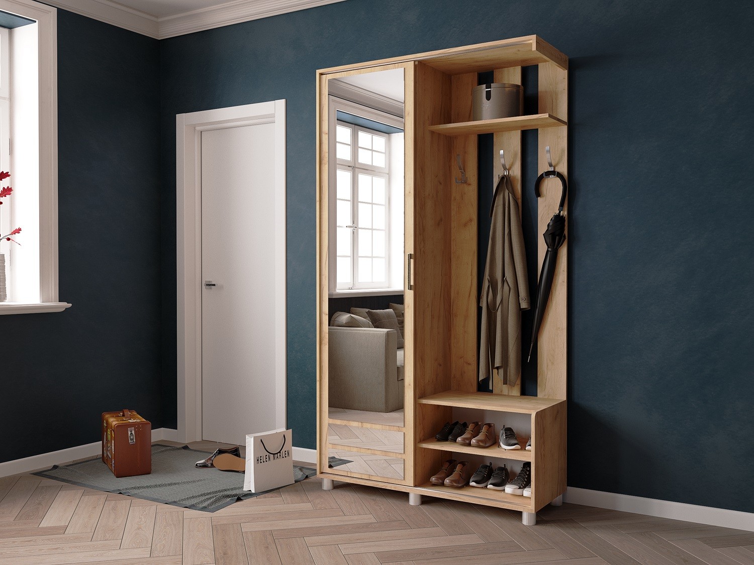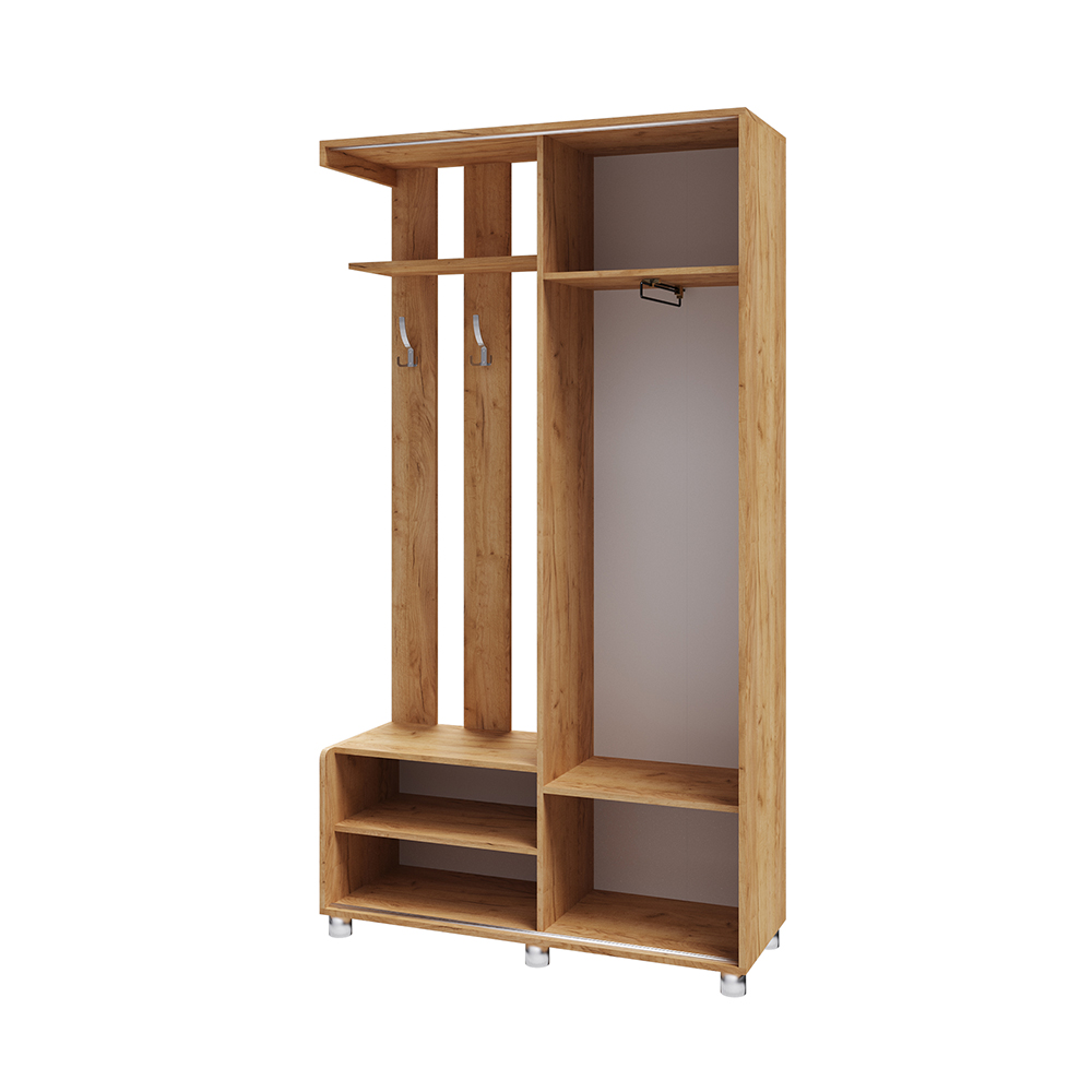 Готовое решение для прихожей Ларго-2 сочетает в себе универсальный дизайн, компактный размер и продуманное наполнение. Модуль оснащен евроштангой за зеркальной дверцей для верхней одежды на плечиках, 2-мя закрытыми полками, открытой тумбой под обувь, 3-мя надежными крючками и верхней полкой для аксессуаров. Это отличный вариант для организации храния в малогабаритной прихожей или узком коридоре.