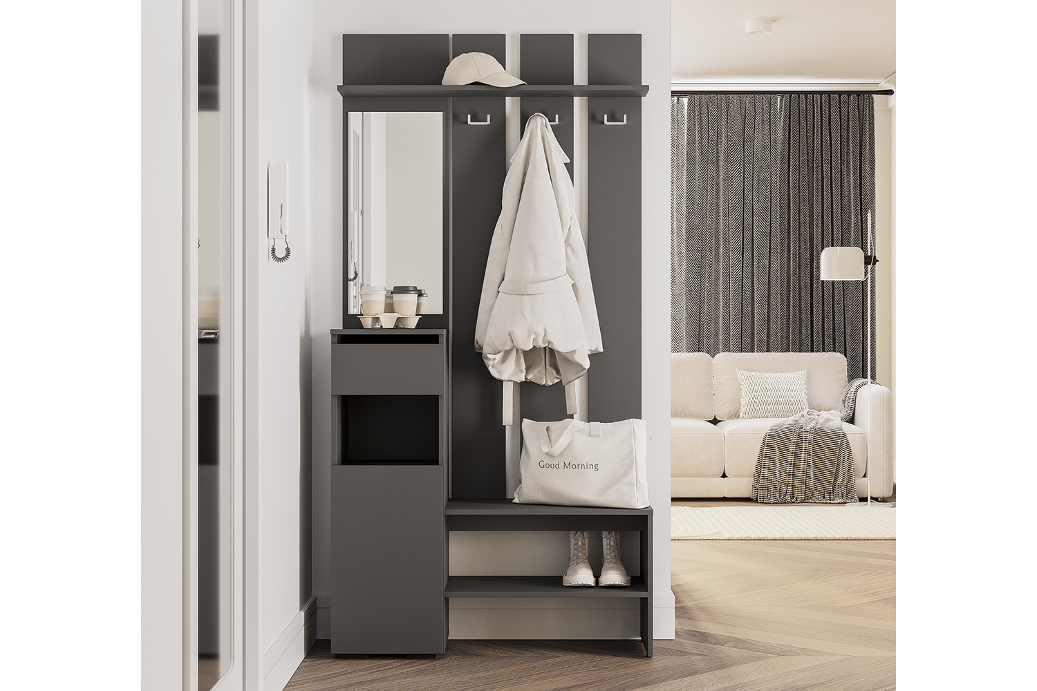 Прихожая «Мия» представлена в двух трендовых оттенках, которые дополнят прихожую в нейтральных тонах или подчеркнут пространство с яркими акцентами в интерьере. Простая геометрическая конструкция без лицевой фурнитуры создаст атмосферу лёгкости и визуально расширит прихожую. Для комфортной подготовки к выходу из дома модель дополнена вертикальным зеркалом.