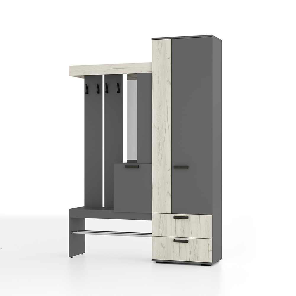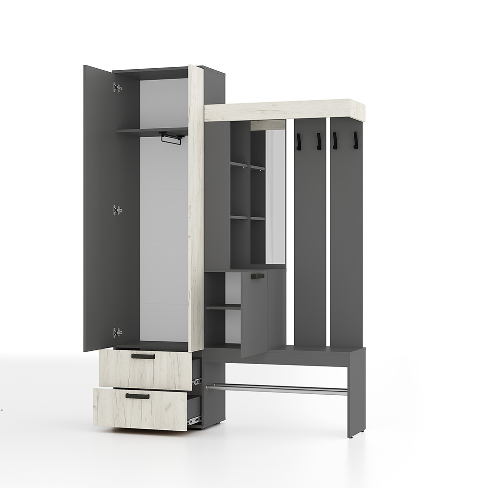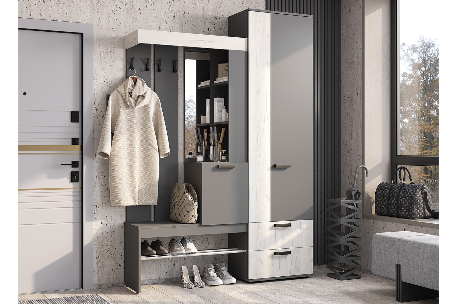 Изящная и практичная конструкция. Вместительный и компактный шкаф с отделением для верхней одежды и выдвижными ящиками. Удобная подставка под обувь (металлическая труба). Эргономичная основная секция с крючками для одежды, полками для мелочей, зеркалом и одним закрытым отделением. Контрастное исполнение в трендовых оттенках.
