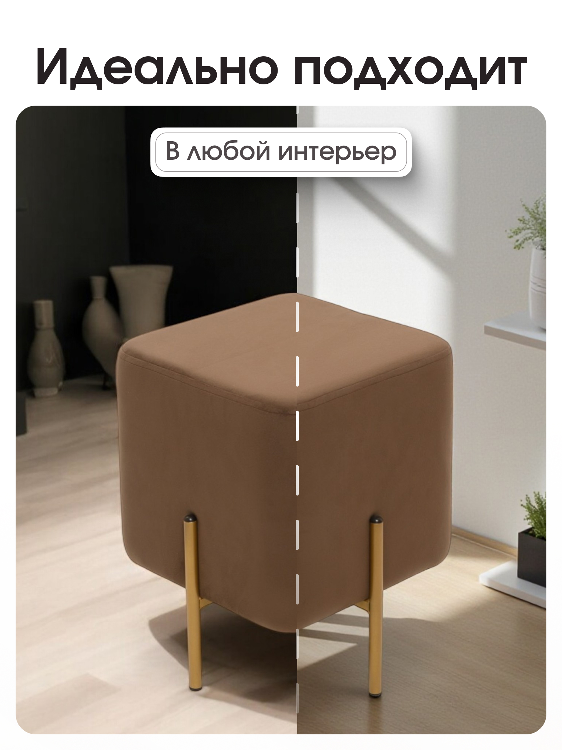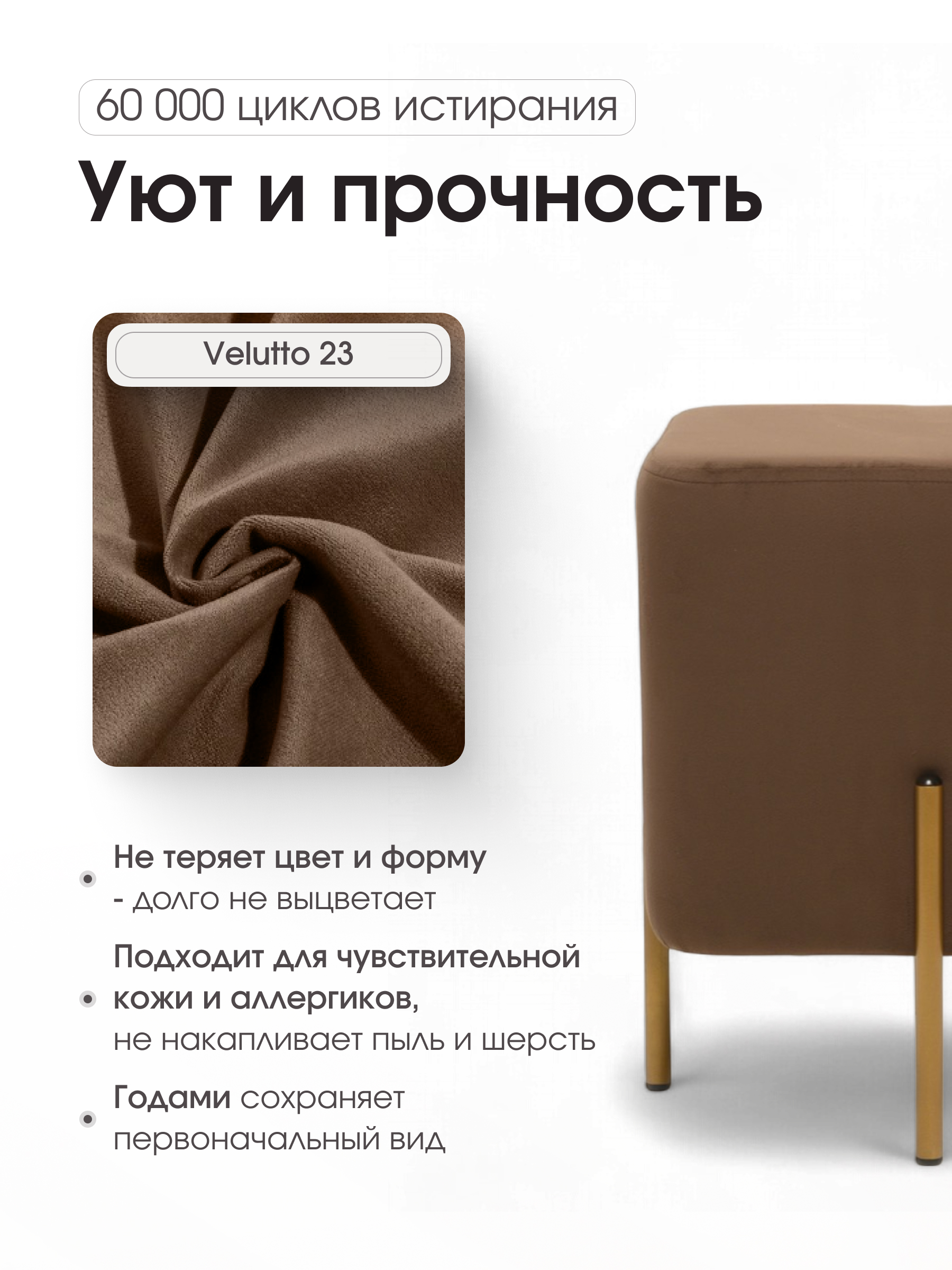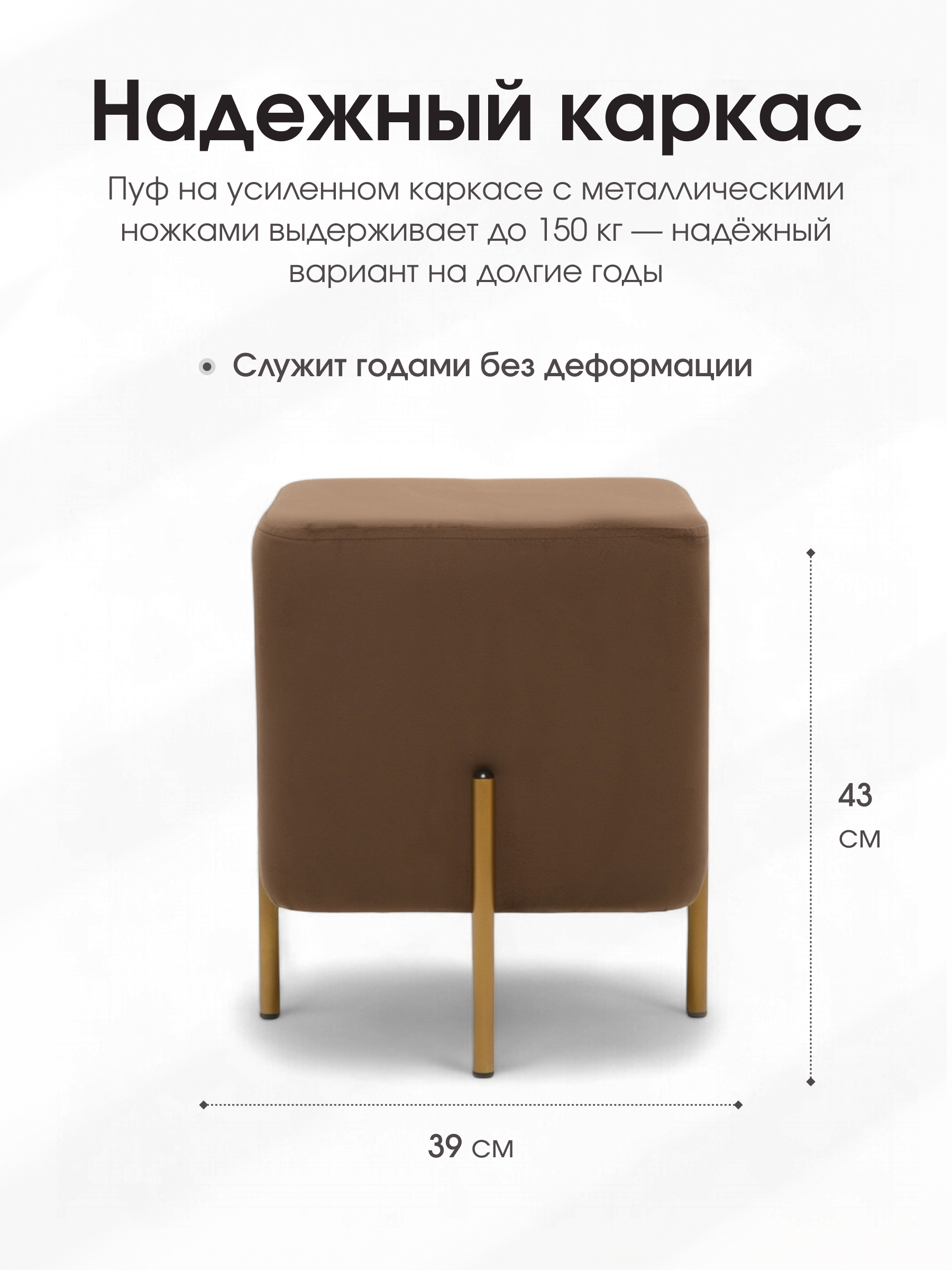 Пуф «Аликанте» - находка для ценителей минимализма. Габариты: Длина: 39 см Ширина: 39 см Высота: 43 см Квадратный пуфик выполнен из прочного ДСП высокого качества, выдерживает максимальную нагрузку в 150 кг. Пуф обтянут приятной велюровой тканью, которая легко чистится влажной губкой. Внутри плотный поролон, который сохраняет свою форму при длительной эксплуатации. Пуф стоит на четырёх металлических ножках, со специальными заглушками, которые позаботятся о Вашем напольном покрытии. Помимо прямого предназначения можно использовать как подставку для ног. Высокое качество материалов, из которых изготовлена модель, способствуют сохранению ее первозданного вида на протяжении очень длительного времени. На выбор четыре расцветки: бежевый, серый, коричневый и синий. Современная модель подойдёт не только для дома, но и для кафе, кофейни и ресторана. На данный товар распространяется гарантия 12 месяцев. Поставляются пуфы в гофрокоробе.